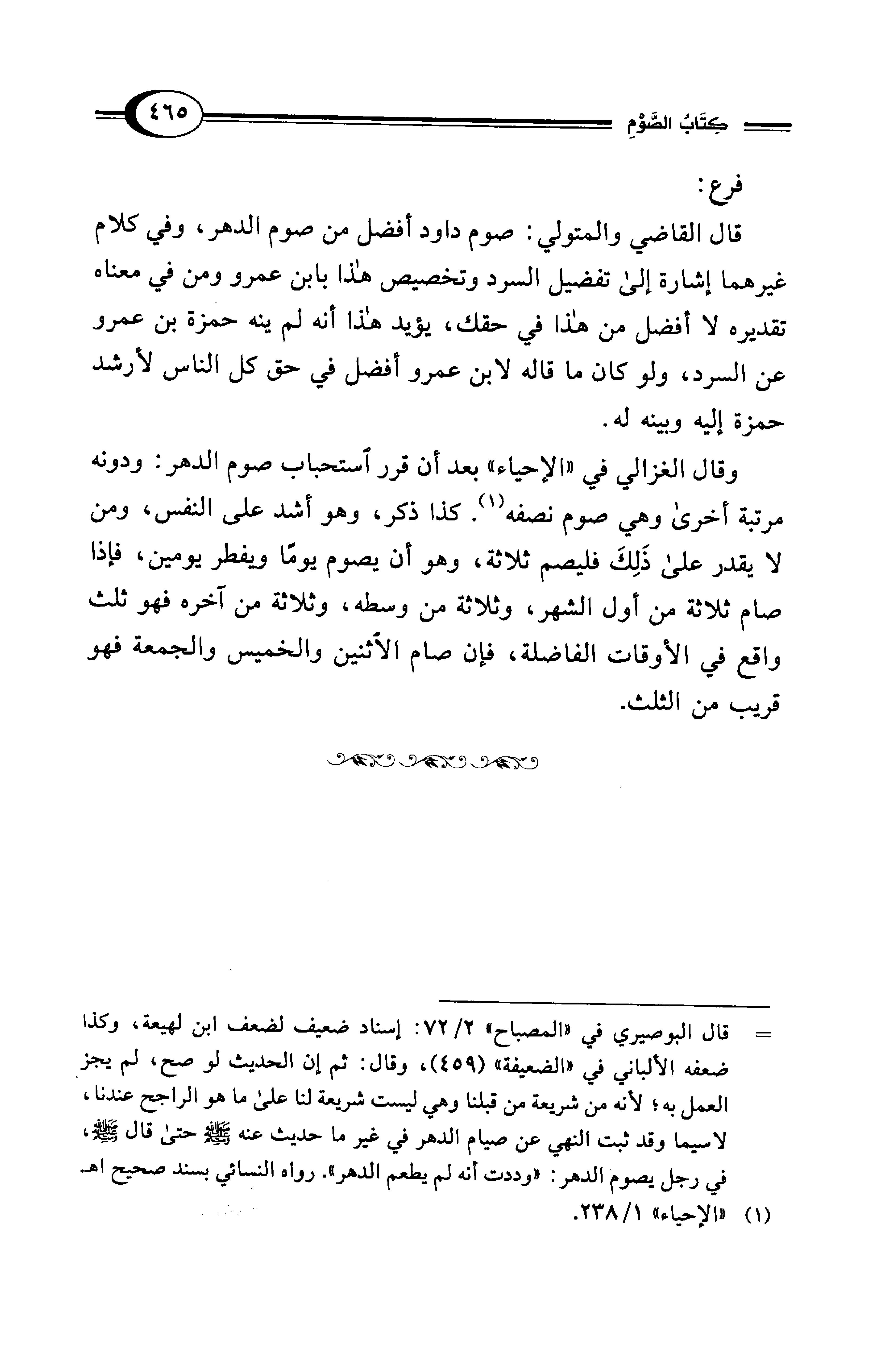 وقال الغزالي في "الإحياء" بعد أن قرر استحباب صوم الدهر: ودونه مرتبة أخرى وهي صوم نصفه (¬1). كذا ذكر، وهو أشد على النفس، ومن لا يقدر على ذَلِكَ فليصم ثلاثة، وهو أن يصوم يومًا ويفطر يومين، فإذا صام ثلاثة من أول الشهر، وثلاثة من وسطه، وثلاثة من آخره فهو ثلث واقع في الأوقات الفاضلة، فإن صام الاثنين والخميس والجمعة فهو قريب من الثلث.