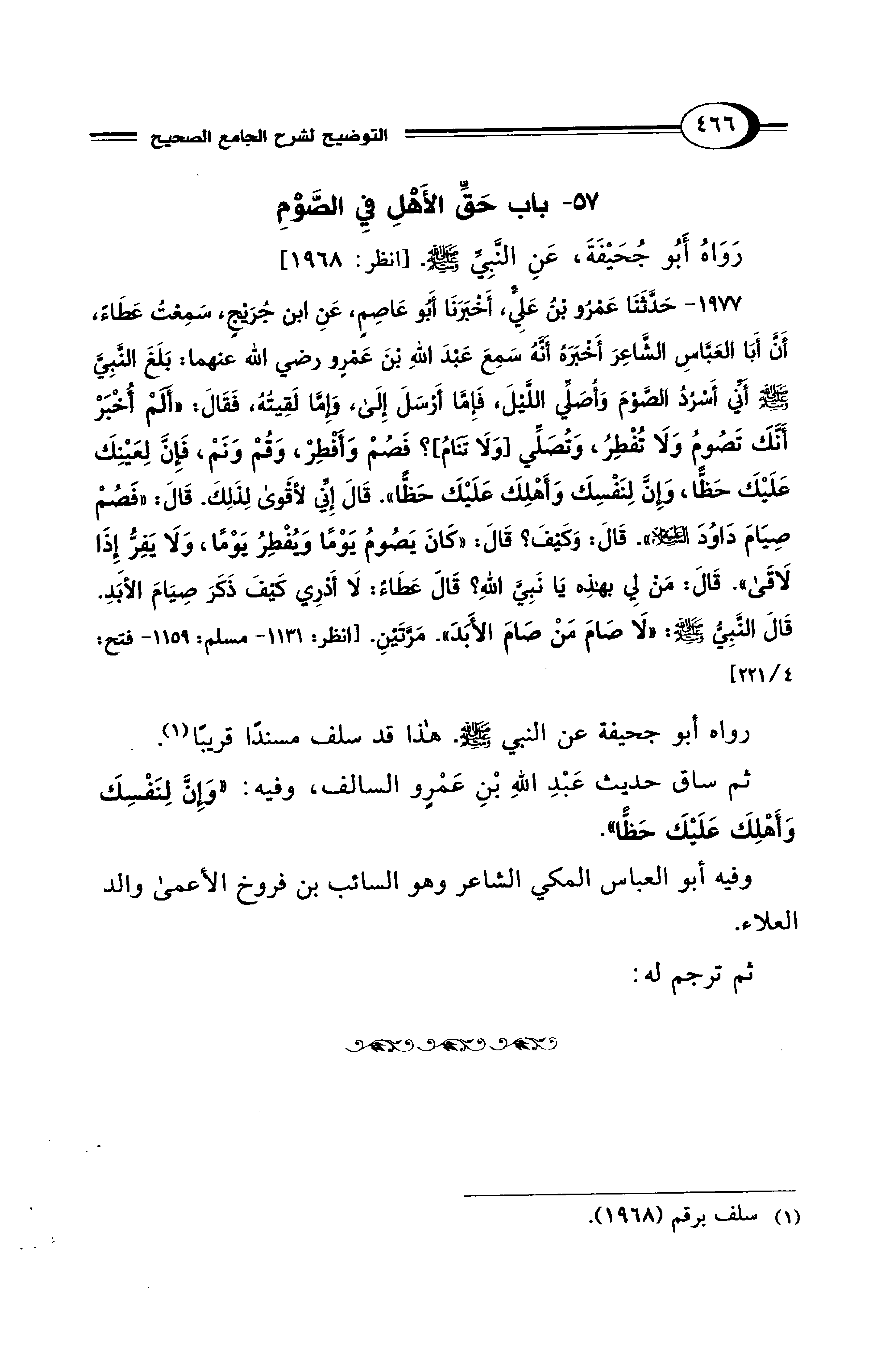 1977 - حَدَّثَنَا عَمْرُو بْنُ عَلِيٍّ، أَخْبَرَنَا أَبُو عَاصِمٍ، عَنِ ابْنِ جُرَيْجٍ، سَمِعْتُ عَطَاءً، أَنَّ أَبَا العَبَّاسِ الشَّاعِرَ أَخْبَرَهُ أَنَّهُ سَمِعَ عَبْدَ اللهِ بْنَ عَمْرٍو رضى الله عنهما: بَلَغَ النَّبِيَّ - صلى الله عليه وسلم - أَنِّي أَسْرُدُ الصَّوْمَ وَأُصَلِّي اللَّيْلَ، فَإِمَّا أَرْسَلَ إِلَىَّ، وَإِمَّا لَقِيتُهُ، فَقَالَ: "أَلَمْ أُخْبَرْ أَنَّكَ تَصُومُ وَلَا تُفْطِرُ، وَتُصَلِّى [وَلاَ تَنَامُ]؟ فَصُمْ وَأَفْطِرْ، وَقُمْ وَنَمْ، فَإِنَّ لِعَيْنِكَ عَلَيْكَ حَظًّا، وَإِنَّ لِنَفْسِكَ وَأَهْلِكَ عَلَيْكَ حَظًّا". قَالَ إِنِّي لأَقْوَى لِذَلِكَ. قَالَ: "فَصُمْ صِيَامَ دَاوُدَ - عَلَيْهِ السَّلاَمُ -". قَالَ: وَكَيْفَ؟ قَالَ: "كَانَ يَصُومُ يَوْمًا وَيُفْطِرُ يَوْمًا، وَلاَ يَفِرُّ إِذَا لاَقَى". قَالَ مَنْ لِي بِهَذِهِ يَا نَبِيَّ اللهِ؟ قَالَ عَطَاءٌ: لَا أَدْرِي كَيْفَ ذَكَرَ صِيَامَ الأَبَدِ. قَالَ النَّبِيُّ - صلى الله عليه وسلم -: "لَا صَامَ مَنْ صَامَ الأَبَدَ". مَرَّتَيْنِ. [انظر: 1131 - مسلم: 1159 - فتح: 4/ 221]