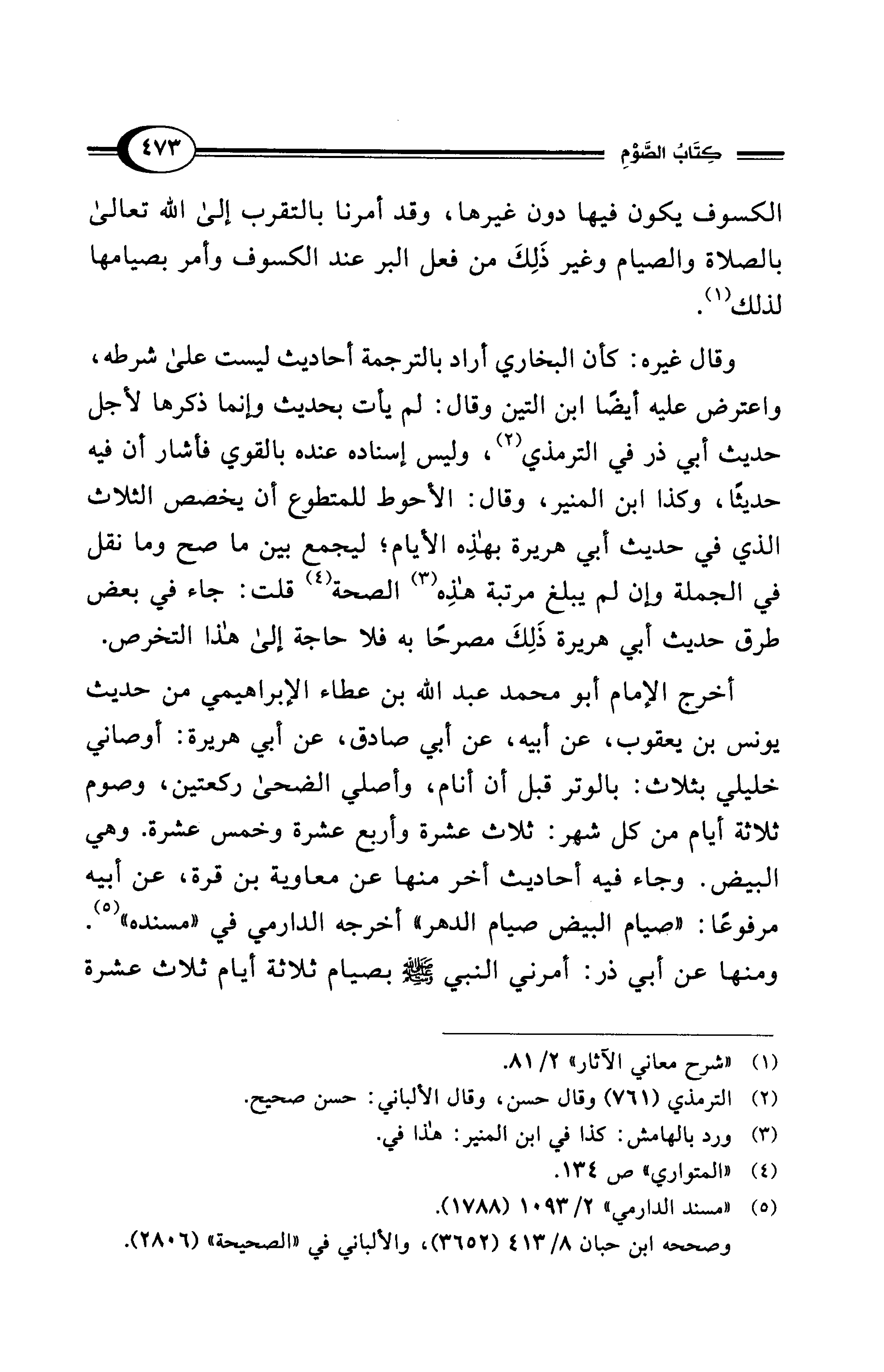 أخرج الإمام أبو محمد عبد الله بن عطاء الإبراهيمي من حديث يونس بن يعقوب، عن أبيه، عن أبي صادق، عن أبي هريرة: أوصاني خليلي بثلاث: بالوتر قبل أن أنام، وأصلي الضحى ركعتين، وصوم ثلاثة أيام من كل شهر: ثلاث عشرة وأربع عشرة وخمس عشرة. وهي البيض. وجاء فيه أحاديث أخر منها عن معاوية بن قرة، عن أبيه مرفوعًا: "صيام البيض صيام الدهر" أخرجه الدارمي في "مسنده" (¬5). ومنها عن أبي ذر: أمرني النبي - صلى الله عليه وسلم - بصيام ثلاثة أيام ثلاث عشرة