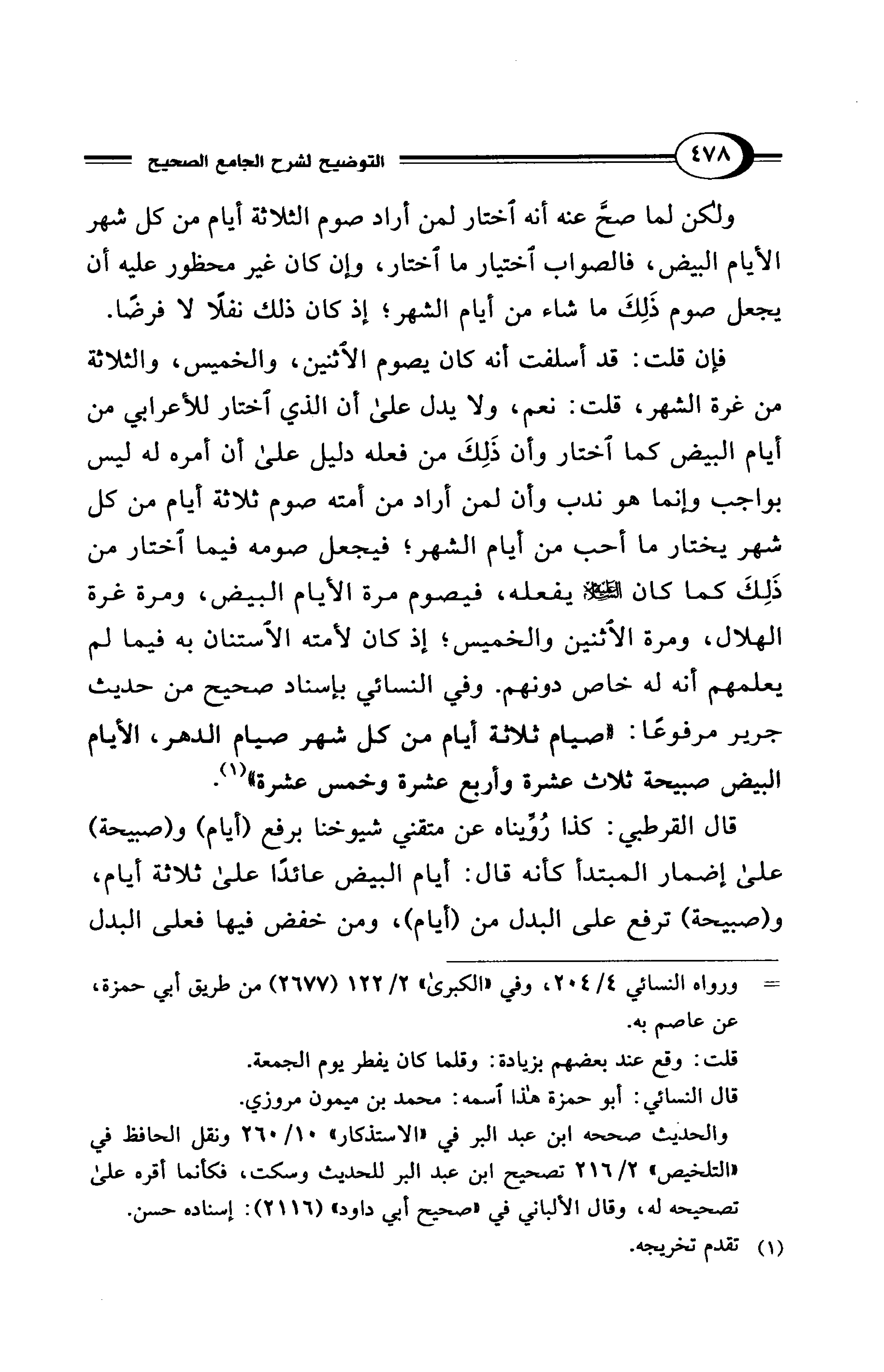 فإن قلت: قد أسلفت أنه كان يصوم الاثنين، والخميس، والثلاثة من غرة الشهر، قلت: نعم، ولا يدل على أن الذي اختار للأعرابي من أيام البيض كما اختار وأن ذَلِكَ من فعله دليل على أن أمره له ليس بواجب وإنما هو ندب وأن لمن أراد من أمته صوم ثلاثة أيام من كل شهر يختار ما أحب من أيام الشهر؛ فيجعل صومه فيما اختار من ذَلِكَ كما كان - عليه السلام - يفعله، فيصوم مرة الأيام البيض، ومرة غرة الهلال، ومرة الاثنين والخميس؛ إذ كان لأمته الاستنان به فيما لم يعلمهم أنه له خاص دونهم. وفي النسائي بإسناد صحيح من حديث جرير مرفوعًا: "صيام ثلاثة أيام من كل شهر صيام الدهر، الأيام البيض صبيحة ثلاث عشرة وأربع عشرة وخمس عشرة " (¬1).