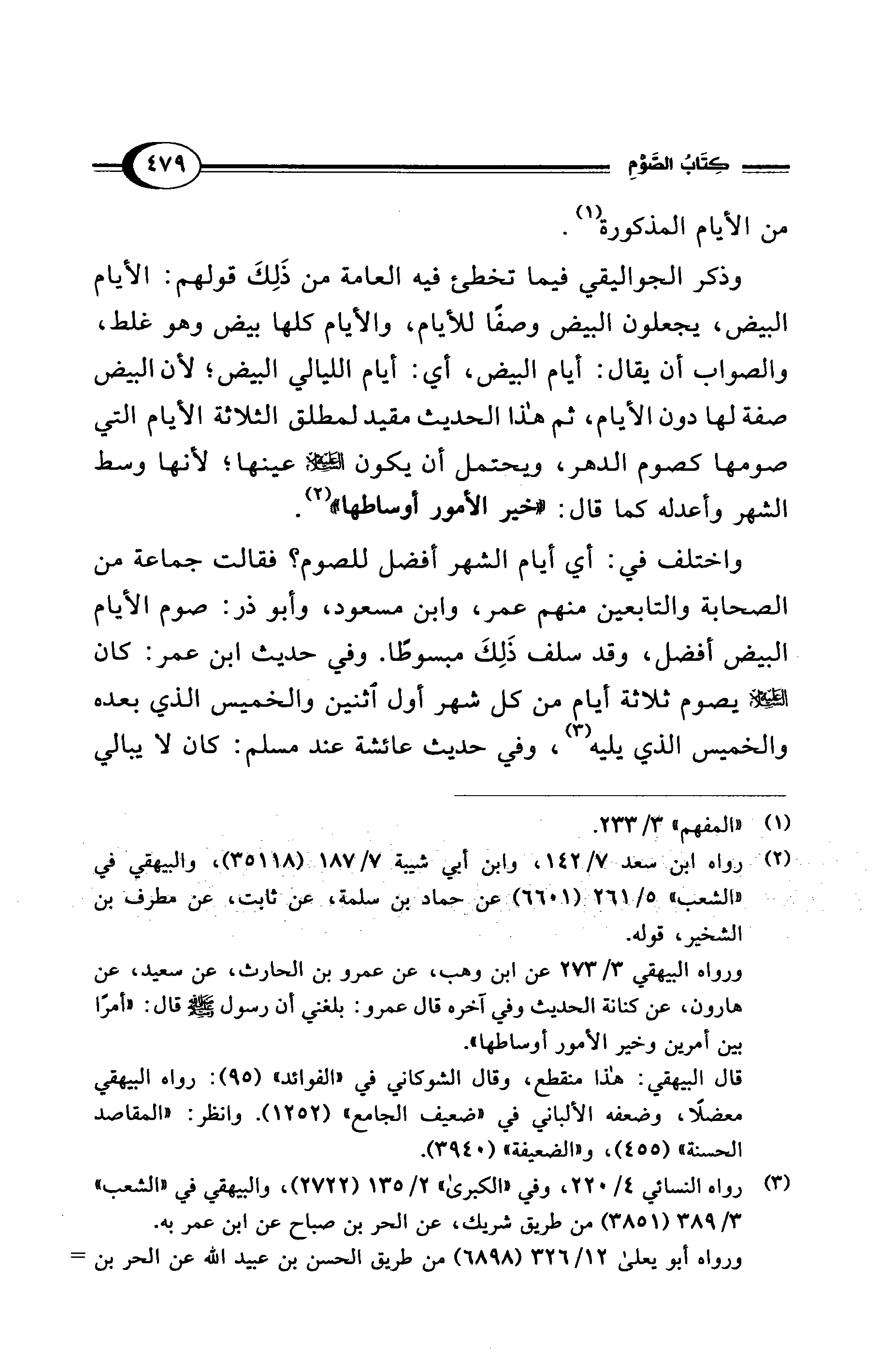 وذكر الجواليقي فيما تخطئ فيه العامة من ذَلِكَ قولهم: الأيام البيض، يجعلون البيض وصفًا للأيام، والأيام كلها بيض وهو غلط، والصواب أن يقال: أيام البيض، أي: أيام الليالي البيض؛ لأن البيض صفة لها دون الأيام، ثم هذا الحديث مقيد لمطلق الثلاثة الأيام التي صومها كصوم الدهر، ويحتمل أن يكون - عليه السلام - عينها؛ لأنها وسط الشهر وأعدله كما قال: "خير الأمور أوساطها" (¬2).