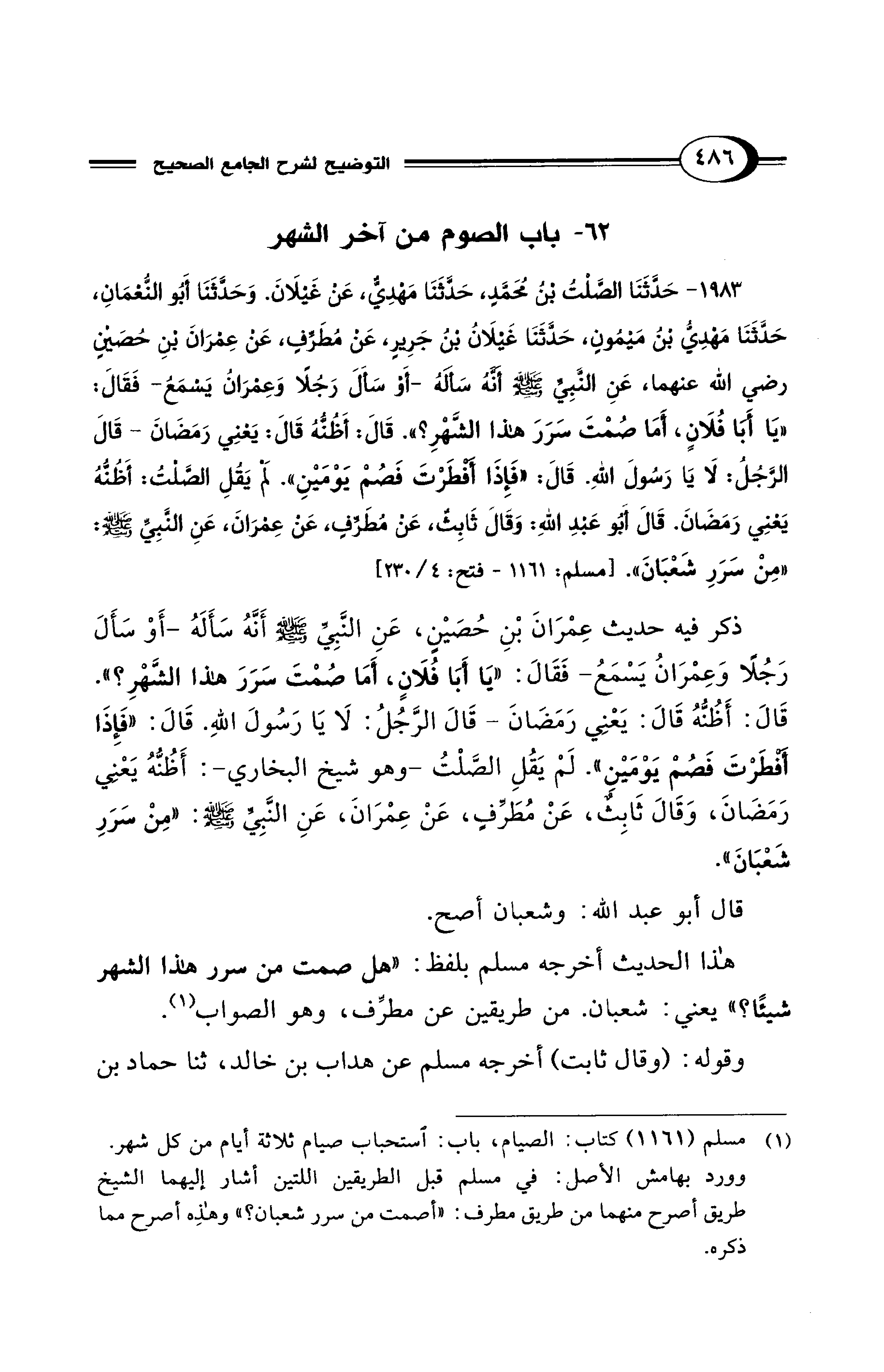 وورد بهامش الأصل: في مسلم قبل الطريقين اللتين أشار إليهما الشيخ طريق أصرح منهما من طريق مطرف: "أصمت من سرر شعبان؟ " وهذِه أصرح مما ذكره.