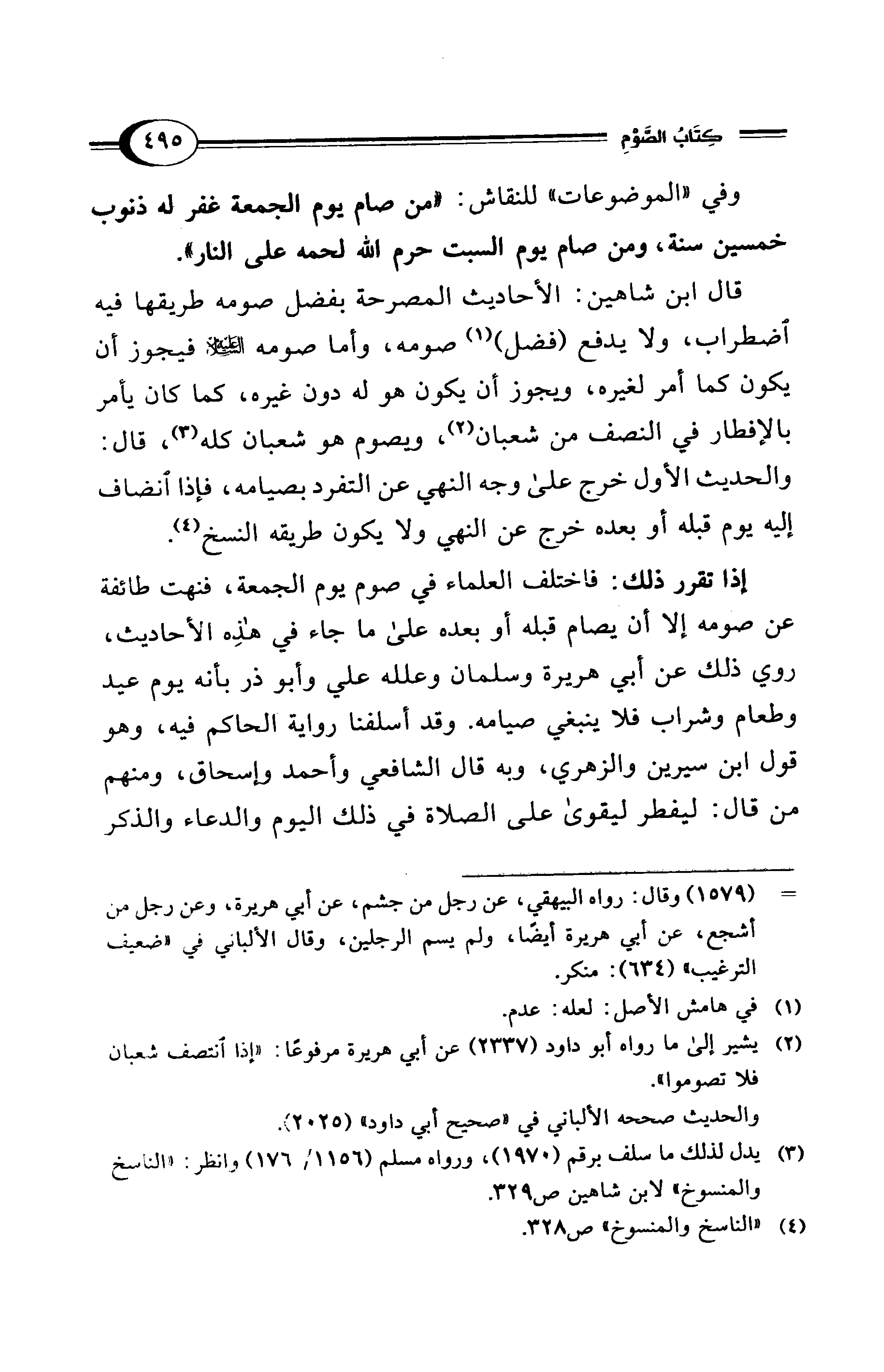 إذا تقرر ذلك: فاختلف العلماء في صوم يوم الجمعة، فنهت طائفة عن صومه إلا أن يصام قبله أو بعده على ما جاء في هذِه الأحاديث، روي ذلك عن أبي هريرة وسلمان وعلله علي وأبو ذر بأنه يوم عيد