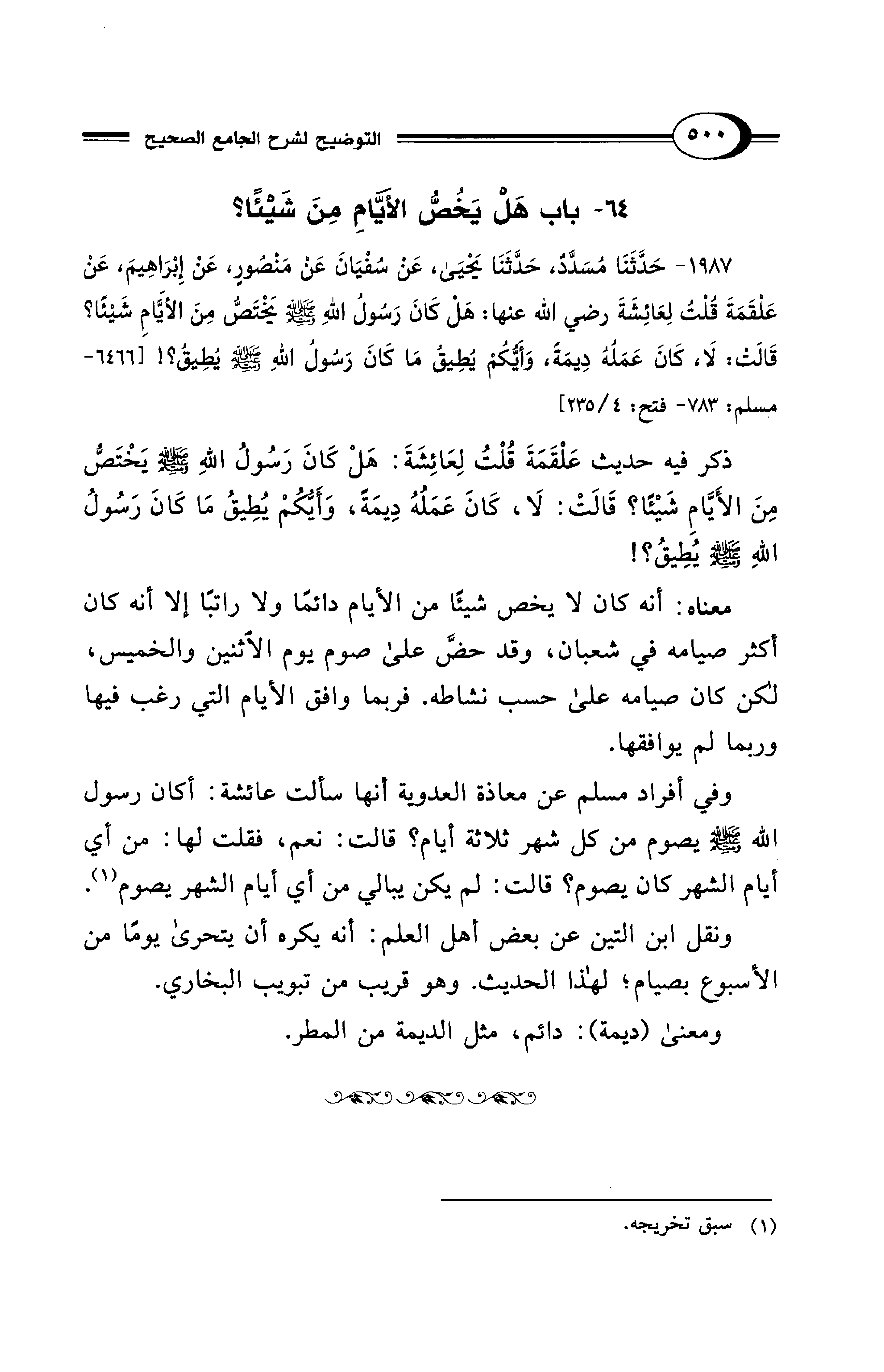 1987 - حَدَّثَنَا مُسَدَّدٌ، حَدَّثَنَا يَحْيَى، عَنْ سُفْيَانَ عَنْ مَنْصُورٍ، عَنْ إِبْرَاهِيمَ، عَنْ عَلْقَمَةَ قُلْتُ لِعَائِشَةَ رضي الله عنها: هَلْ كَانَ رَسُولُ اللهِ - صلى الله عليه وسلم - يَخْتَصُّ مِنَ الأَيَّامِ شَيْئًا؟ قَالَتْ: لَا، كَانَ عَمَلُهُ دِيمَةً، وَأَيُّكُمْ يُطِيقُ مَا كَانَ رَسُولُ اللهِ - صلى الله عليه وسلم - يُطِيقُ؟! [6466 - مسلم: 783 - فتح: 4/ 235]