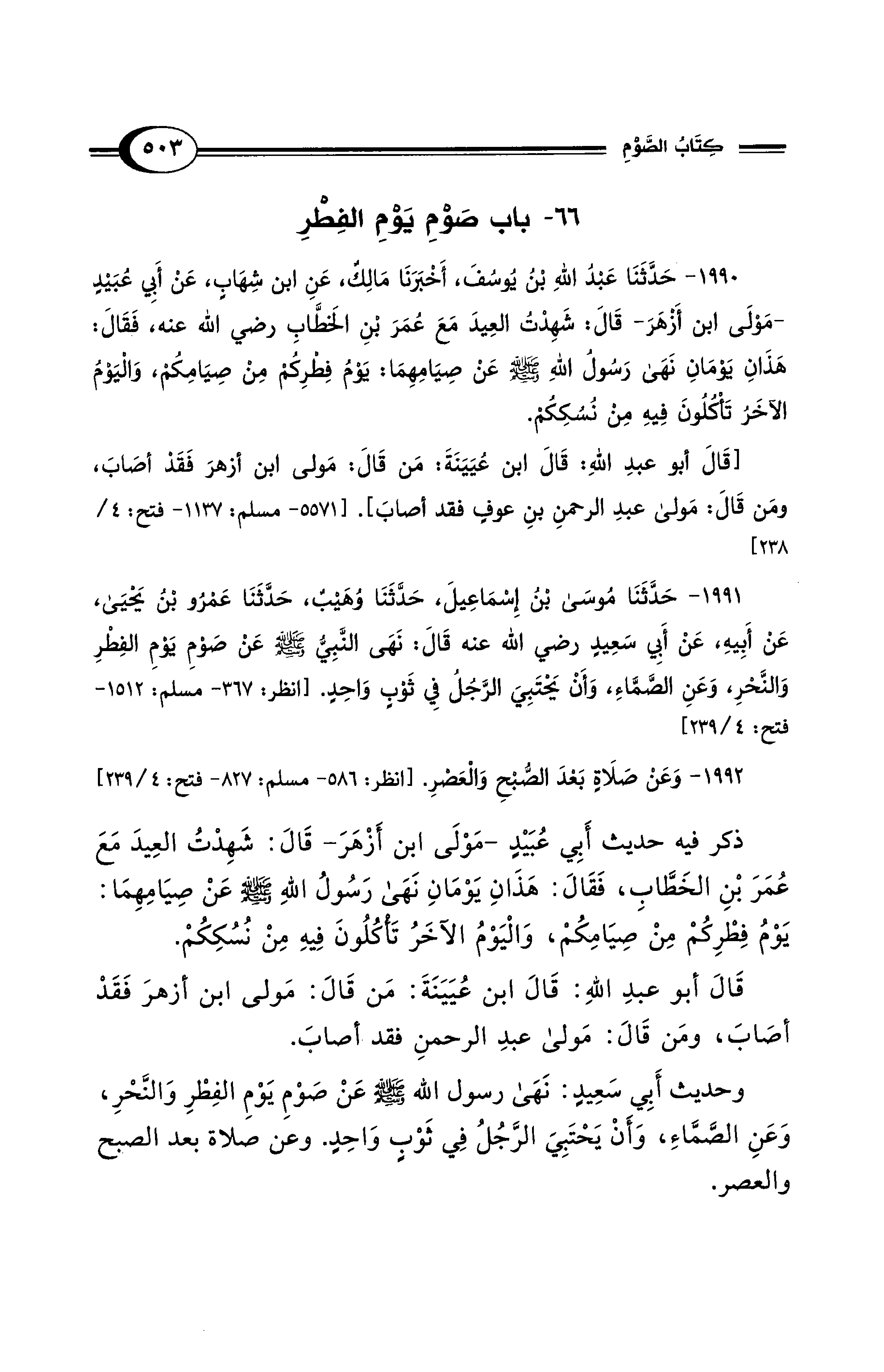 1990 - حَدَّثَنَا عَبْدُ اللهِ بْنُ يُوسُفَ، أَخْبَرَنَا مَالِكٌ، عَنِ ابْنِ شِهَابٍ، عَنْ أَبِي عُبَيْدٍ -مَوْلَى ابْنِ أَزْهَرَ- قَالَ: شَهِدْتُ العِيدَ مَعَ عُمَرَ بْنِ الخَطَّابِ رضي الله عنه، فَقَالَ: هَذَانِ يَوْمَانِ نَهَى رَسُولُ اللهِ - صلى الله عليه وسلم - عَنْ صِيَامِهِمَا: يَوْمُ فِطْرِكُمْ مِنْ صِيَامِكُمْ، وَاليَوْمُ الآخَرُ تَأْكُلُونَ فِيهِ مِنْ نُسُكِكُمْ.