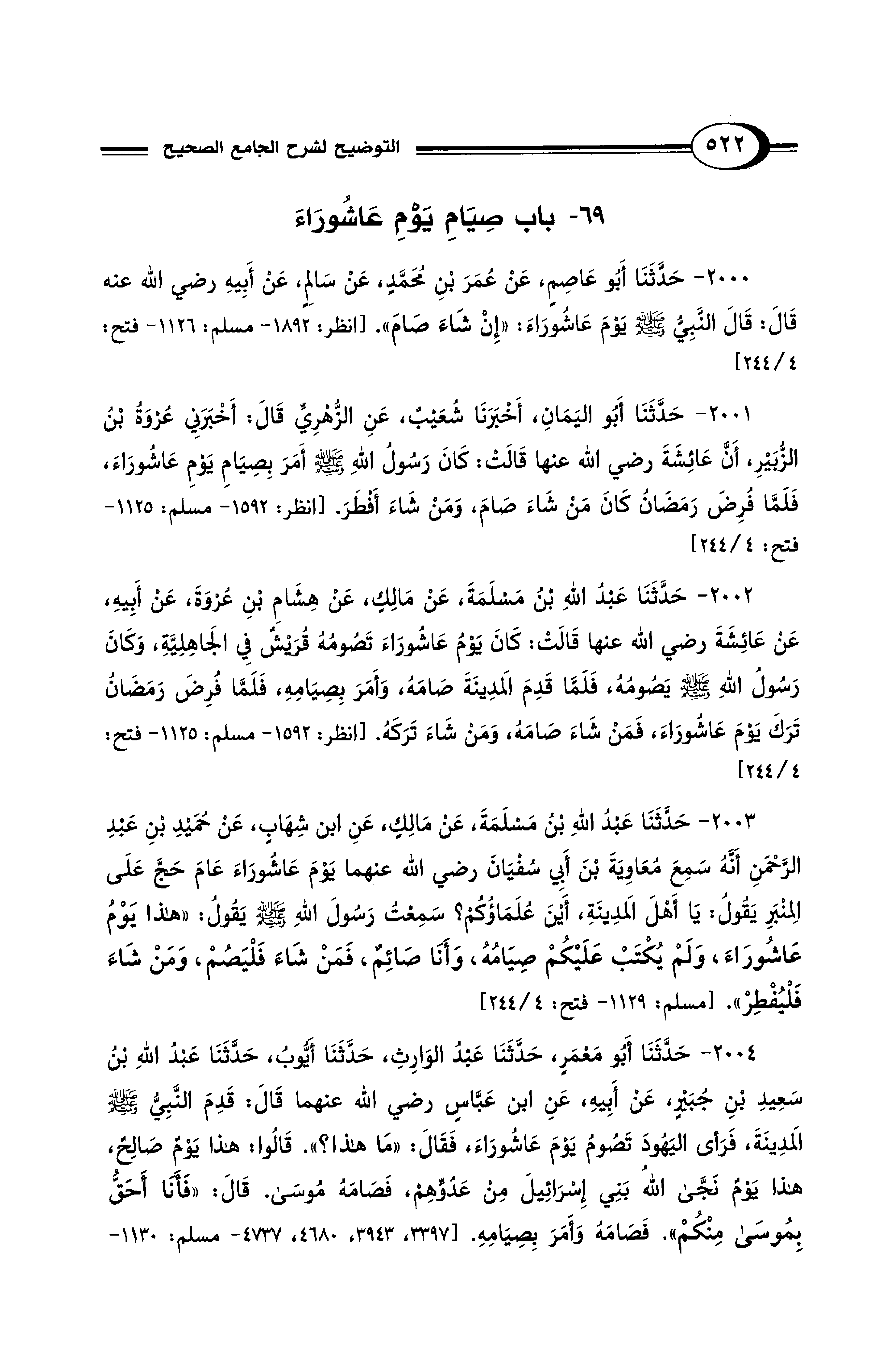 2000 - حَدَّثَنَا أَبُو عَاصِمٍ، عَنْ عُمَرَ بْنِ مُحَمَّدٍ، عَنْ سَالِمٍ عَنْ أَبِيهِ رضي الله عنه قَالَ: قَالَ النَّبِيُّ - صلى الله عليه وسلم - يَوْمَ عَاشُورَاءَ: "إِنْ شَاءَ صَامَ". [انظر: 1892 - مسلم: 1126 - فتح: 4/ 244]