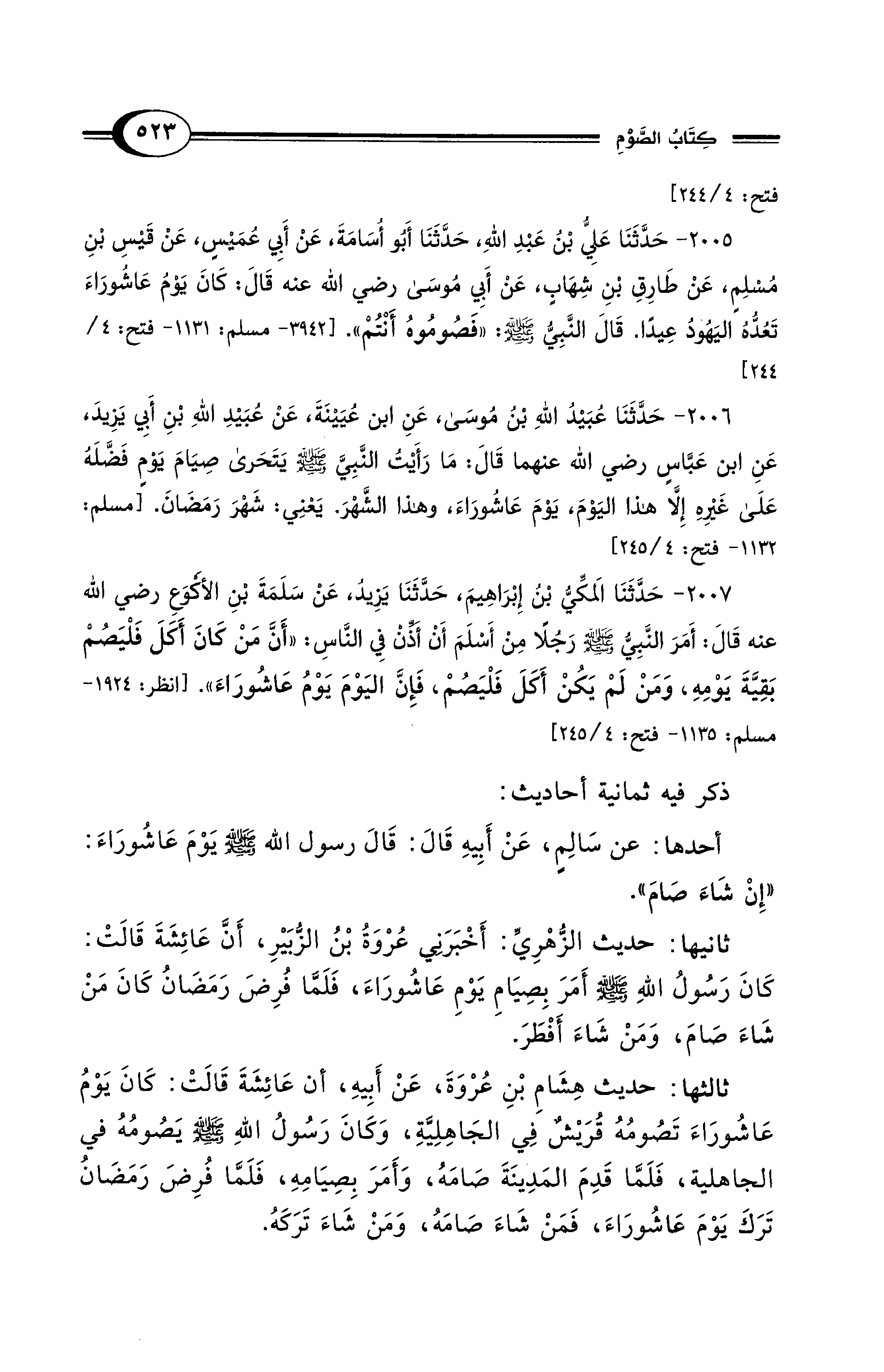 2005 - حَدَّثَنَا عَلِيُّ بْنُ عَبْدِ اللهِ، حَدَّثَنَا أَبُو أُسَامَةَ، عَنْ أَبِي عُمَيْسٍ، عَنْ قَيْسِ بْنِ مُسْلِمٍ، عَنْ طَارِقِ بْنِ شِهَابٍ، عَنْ أَبِي مُوسَى رضي الله عنه قَالَ: كَانَ يَوْمُ عَاشُورَاءَ تَعُدُّهُ اليَهُودُ عِيدًا، قَالَ النَّبِيُّ - صلى الله عليه وسلم -: "فَصُومُوهُ أَنْتُمْ". [3942 - مسلم: 1131 - فتح: 4/ 244]