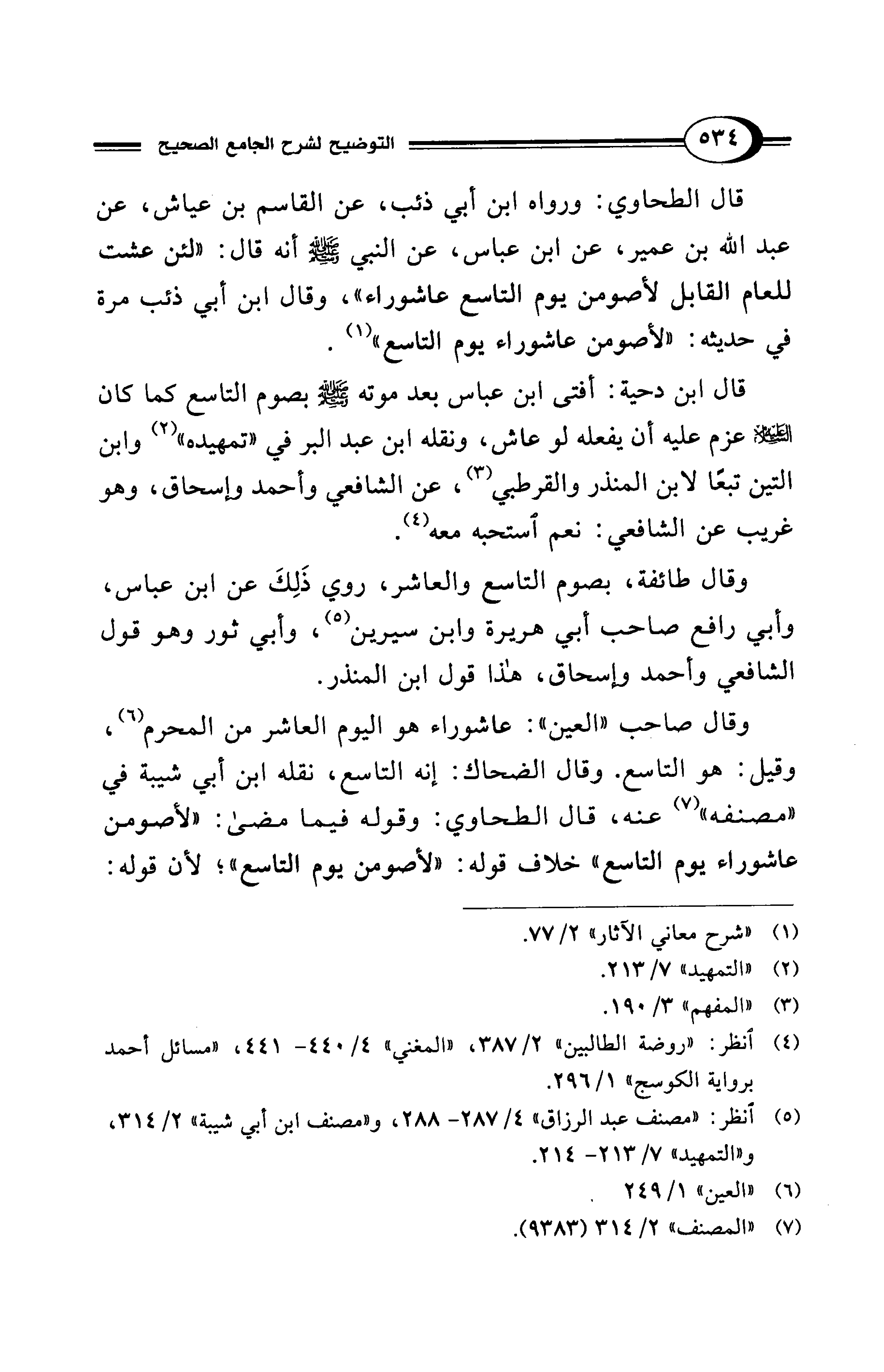 قال الطحاوي: ورواه ابن أبي ذئب، عن القاسم بن عياش، عن عبد الله بن عمير، عن ابن عباس، عن النبي - صلى الله عليه وسلم - أنه قال: "لئن عشت للعام القابل لأصومن يوم التاسع عاشوراء"، وقال ابن أبي ذئب مرة في حديثه: "لأصومن عاشوراء يوم التاسع" (¬1).