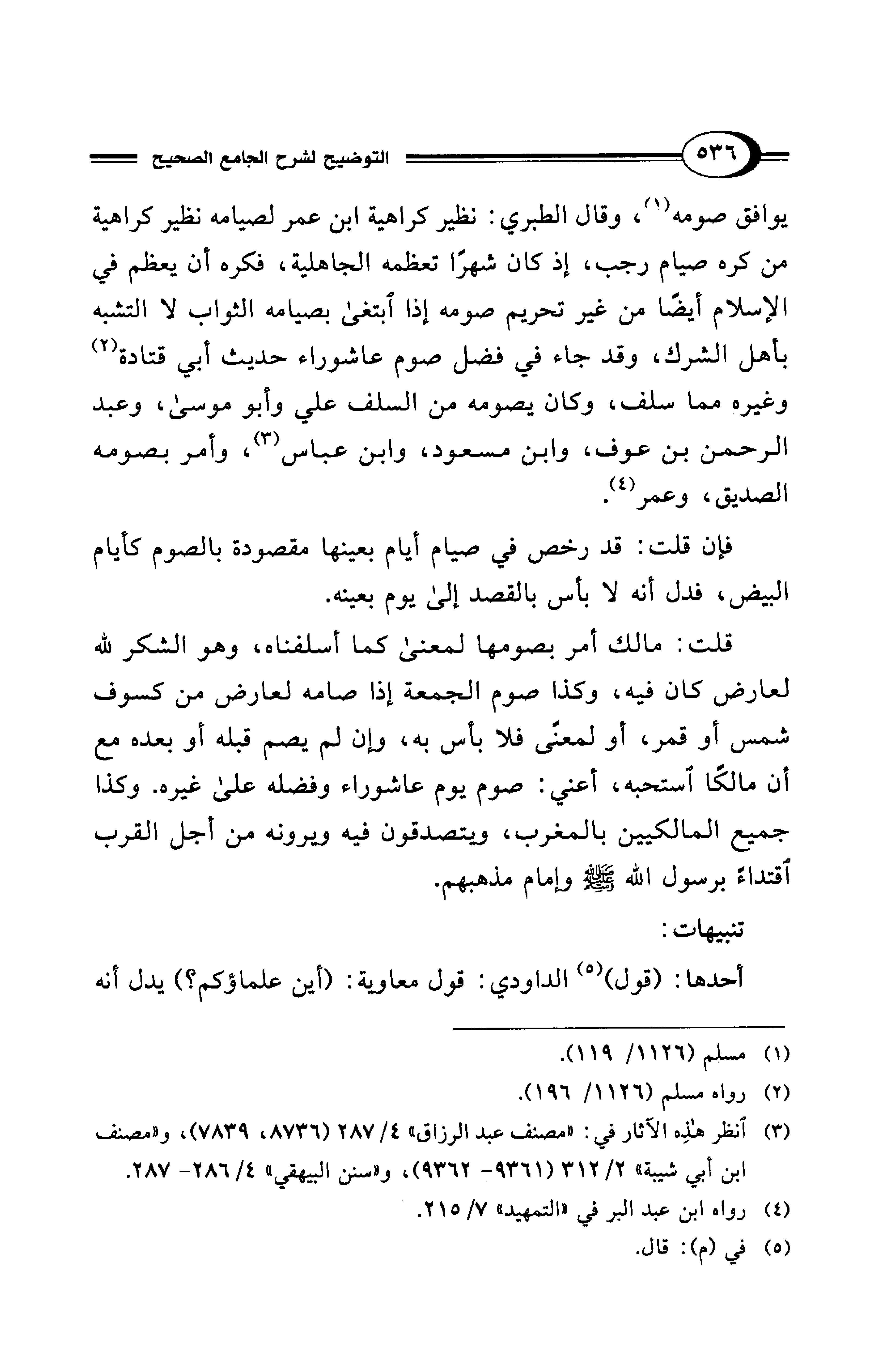 قلت: مالك أمر بصومها لمعنى كما أسلفناه، وهو الشكر لله لعارض كان فيه، وكذا صوم الجمعة إذا صامه لعارض من كسوف شمس أو قمر، أو لمعنًى فلا بأس به، وإن لم يصم قبله أو بعده مع أن مالكًا استحبه، أعني: صوم يوم عاشوراء وفضله على غيره. وكذا جميع المالكيين بالمغرب، ويتصدقون فيه ويرونه من أجل القرب اقتداءً برسول الله - صلى الله عليه وسلم - وإمام مذهبهم.
