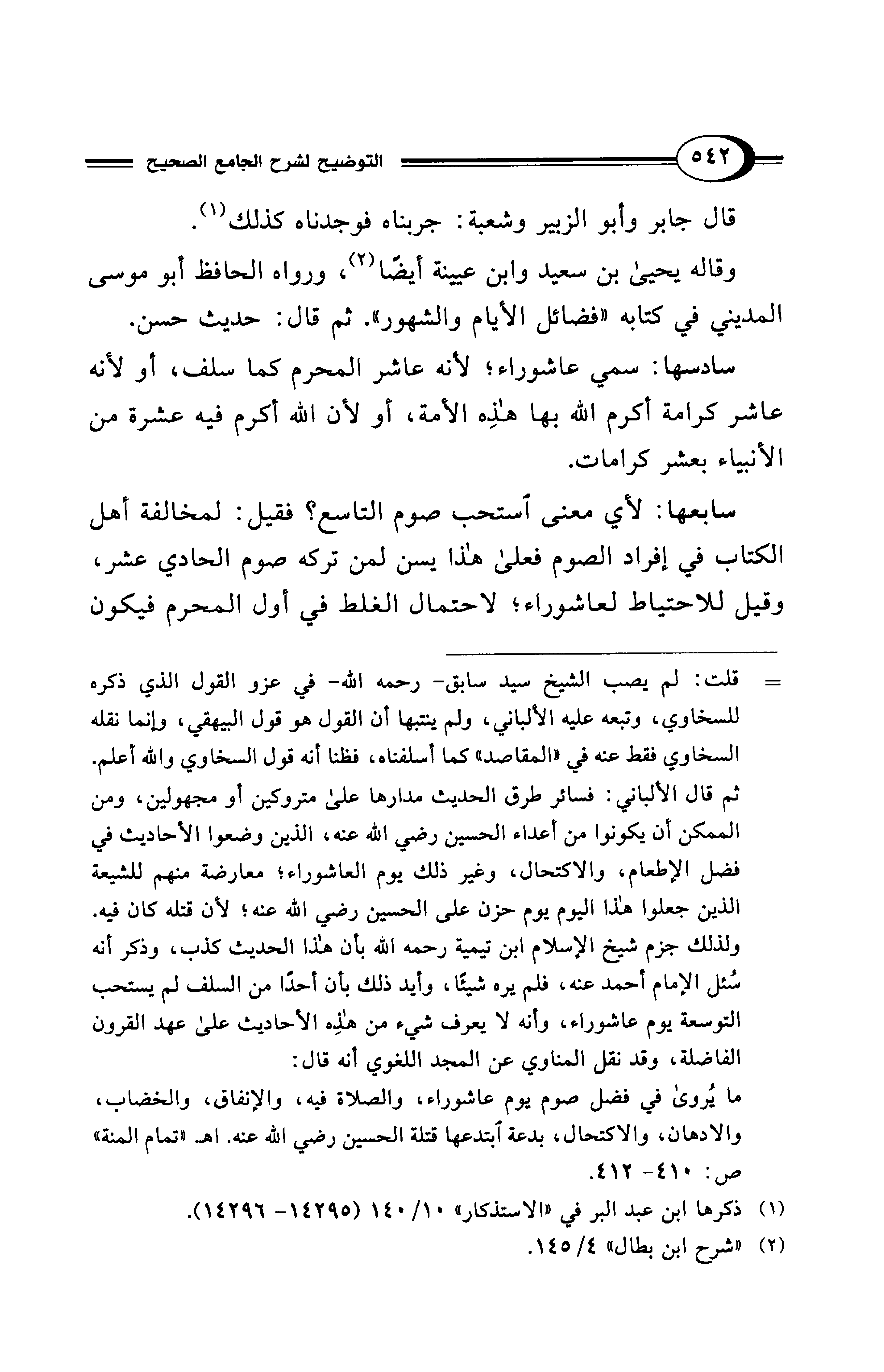 = قلت: لم يصب الشيخ سيد سابق -رحمه الله- في عزو القول الذي ذكره للسخاوي، وتبعه عليه الألباني، ولم ينتبها أن القول هو قول البيهقي، وإنما نقله السخاوي فقط عنه في "المقاصد" كما أسلفناه، فظنا أنه قول السخاوي والله أعلم. ثم قال الألباني: فسائر طرق الحديث مدارها على متروكين أو مجهولين، ومن الممكن أن يكونوا من أعداء الحسين رضي الله عنه، الذين وضعوا الأحاديث في فضل الإطعام، والاكتحال، وغير ذلك يوم العاشوراء؛ معارضة منهم للشيعة الذين جعلوا هذا اليوم يوم حزن على الحسين رضي الله عنه؛ لأن قتله كان فيه. ولذلك جزم شيخ الإسلام ابن تيمية رحمه الله بأن هذا الحديث كذب، وذكر أنه سُئل الإمام أحمد عنه، فلم يره شيئًا، وأيد ذلك بأن أحدًا من السلف لم يستحب التوسعة يوم عاشوراء، وأنه لا يعرف شيء من هذِه الأحاديث على عهد القرون الفاضلة، وقد نقل المناوي عن المجد اللغوي أنه قال: