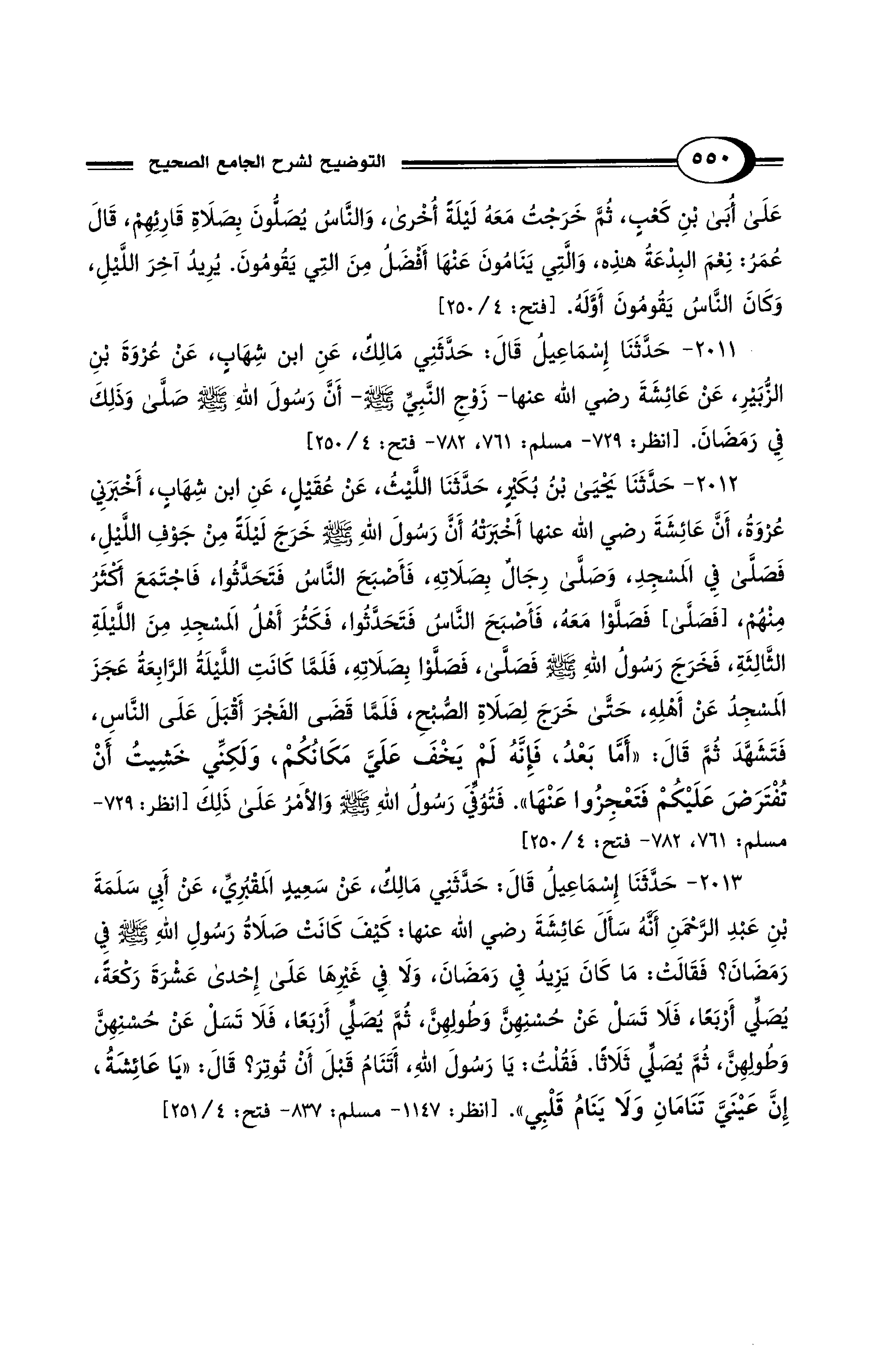 2011 - حَدَّثَنَا إِسْمَاعِيلُ قَالَ: حَدَّثَنِي مَالِكٌ، عَنِ ابْنِ شِهَابٍ، عَنْ عُرْوَةَ بْنِ الزُّبَيْرِ، عَنْ عَائِشَةَ رضي الله عنها -زَوْجِ النَّبِيِّ - صلى الله عليه وسلم -- أَنَّ رَسُولَ اللهِ - صلى الله عليه وسلم - صَلَّى وَذَلِكَ فِي رَمَضَانَ. [انظر: 729 - مسلم: 761، 782 - فتح: 4/ 250]