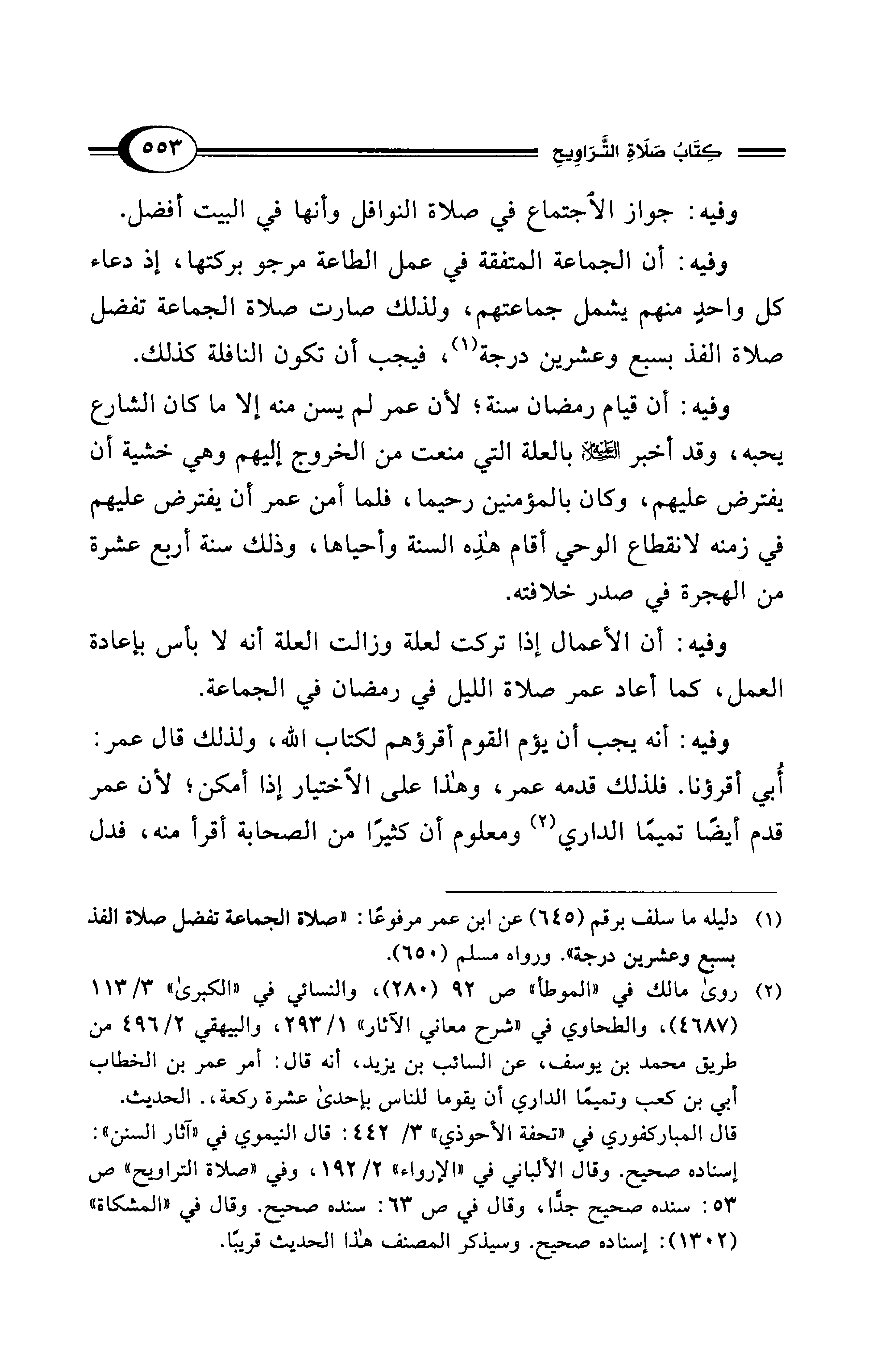 وفيه: أن قيام رمضان سنة؛ لأن عمر لم يسن منه إلا ما كان الشارع يحبه، وقد أخبر - عليه السلام - بالعلة التي منعت من الخروج إليهم وهي خشية أن يفترض عليهم، وكان بالمؤمنين رحيما، فلما أمن عمر أن يفترض عليهم في زمنه لانقطاع الوحي أقام هذِه السنة وأحياها، وذلك سنة أربع عشرة من الهجرة في صدر خلافته.