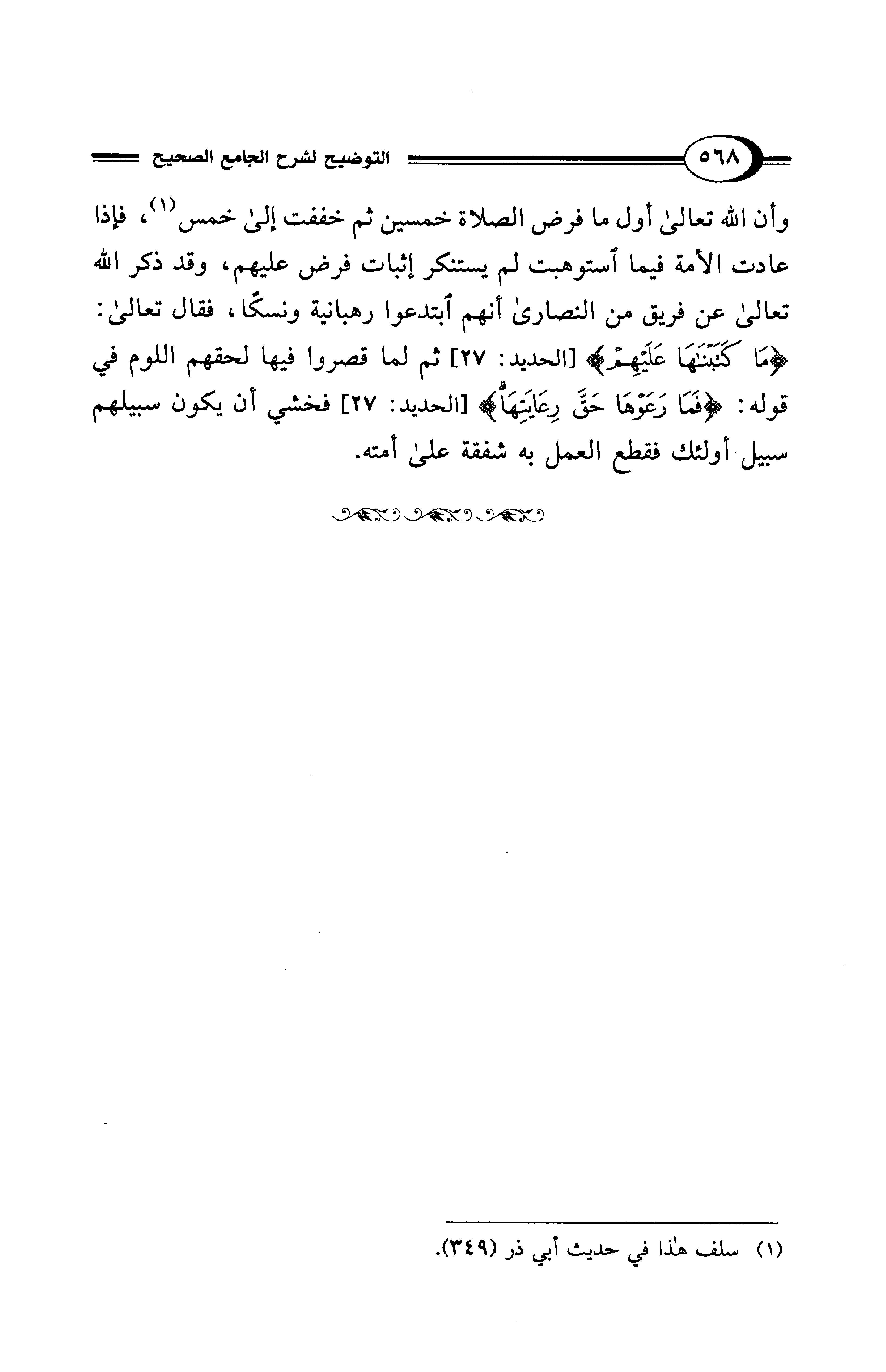وأن الله تعالى أول ما فرض الصلاة خمسين ثم خففت إلى خمس (¬1)، فإذا عادت الأمة فيما استوهبت لم يستنكر إثبات فرض عليهم، وقد ذكر الله تعالى عن فريق من النصارى أنهم ابتدعوا رهبانية ونسكًا، فقال تعالى: {مَا كَتَبْنَاهَا عَلَيْهِمْ} [الحديد: 27]، ثم لما قصروا فيها لحقهم اللوم في قوله: {فَمَا رَعَوْهَا حَقَّ رِعَايَتِهَا} [الحديد: 27] فخشي أن يكون سبيلهم سبيل أولئك فقطع العمل به شفقة على أمته.
