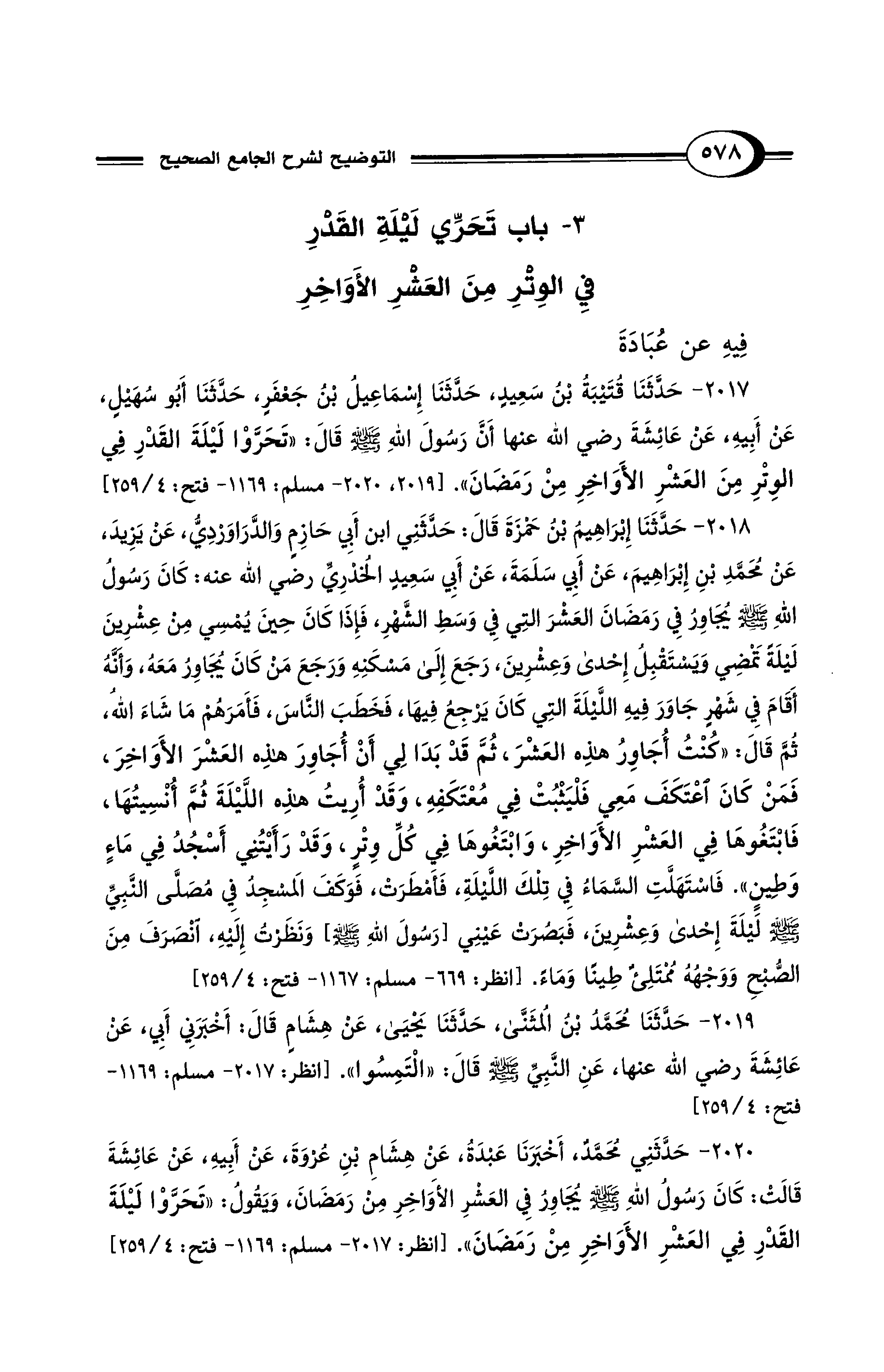 2017 - حَدَّثَنَا قُتَيْبَةُ بْنُ سَعِيدٍ، حَدَّثَنَا إِسْمَاعِيلُ بْنُ جَعْفَرٍ، حَدَّثَنَا أَبُو سُهَيْلٍ، عَنْ أَبِيهِ، عَنْ عَائِشَةَ رضي الله عنها أَنَّ رَسُولَ اللهِ - صلى الله عليه وسلم - قَالَ: "تَحَرَّوْا لَيْلَةَ القَدْرِ فِي الوِتْرِ مِنَ العَشْرِ الأَوَاخِرِ مِنْ رَمَضَانَ". [2019، 2020 - مسلم: 1169 - فتح: 4/ 259]