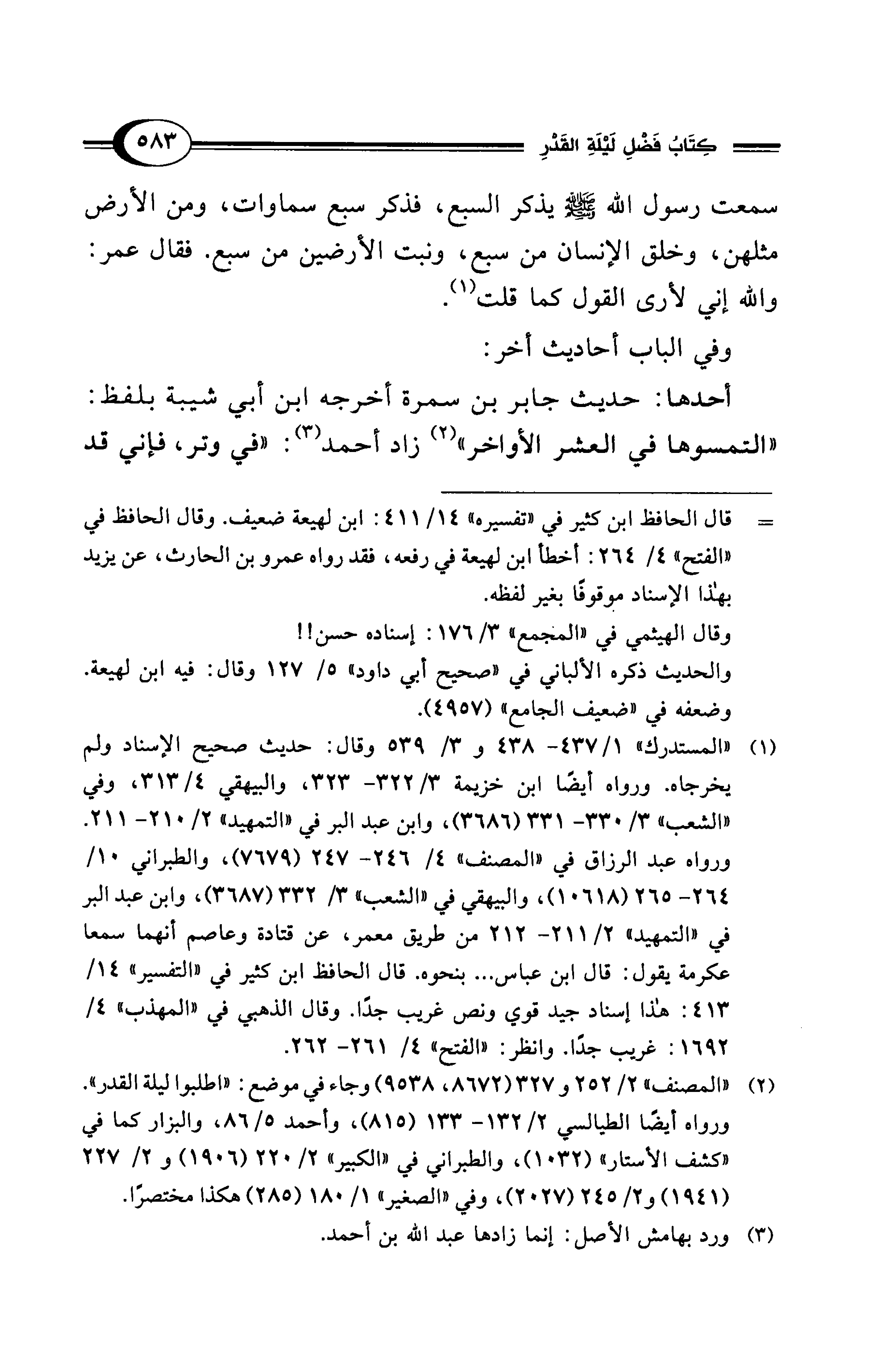 أحدها: حديث جابر بن سمرة أخرجه ابن أبي شيبة بلفظ: "التمسوها في العشر الأواخر" (¬2) زاد أحمد (¬3): "في وتر، فإني قد