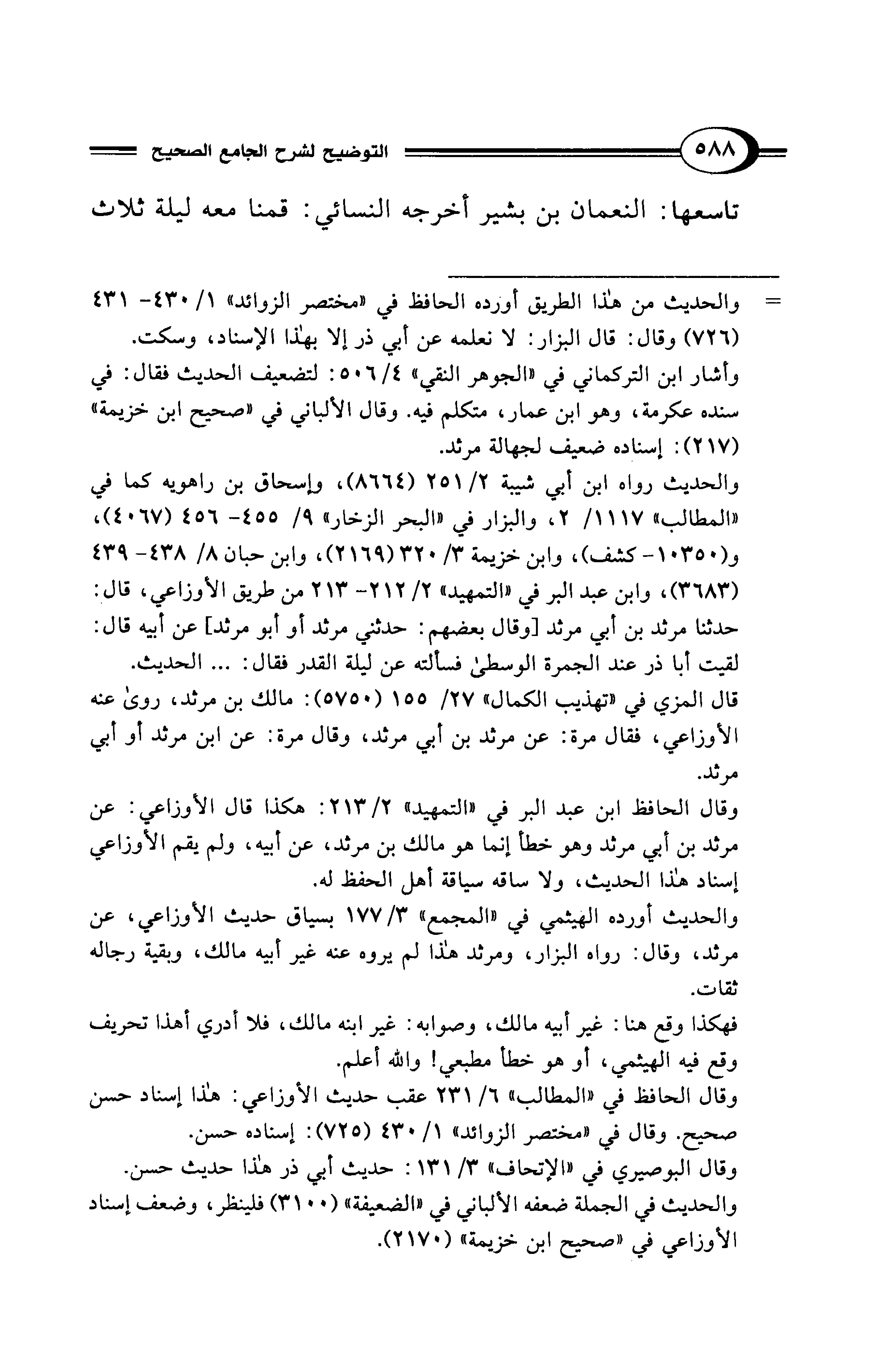 تاسعها: النعمان بن بشير أخرجه النسائي: قمنا معه ليلة ثلاث