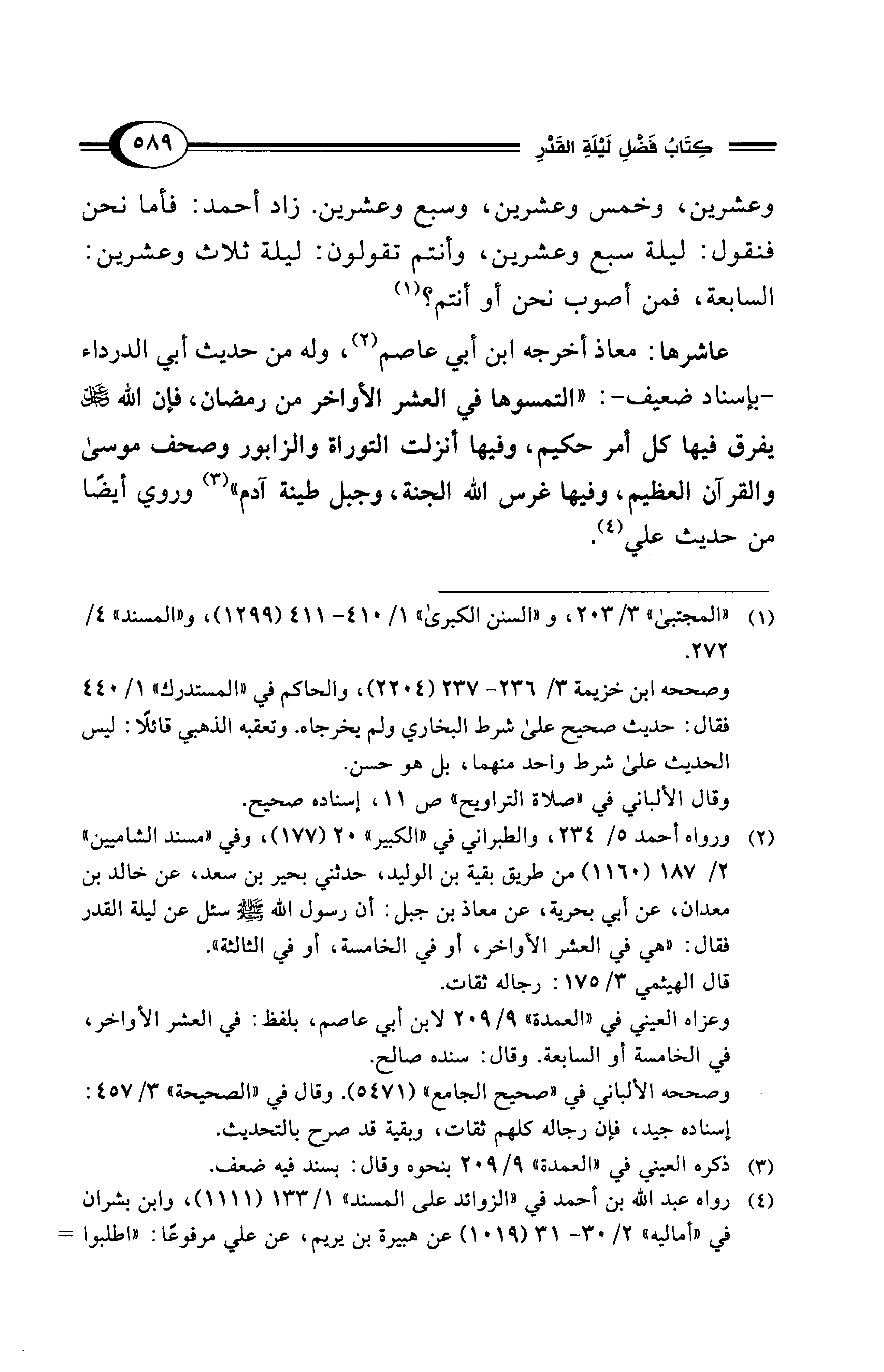 وعشرين، وخمس وعشرين، وسبع وعشرين. زاد أحمد: فأما نحن فنقول: ليلة سبع وعشرين، وأنتم تقولون: ليلة ثلاث وعشرين: السابعة، فمن أصوب نحن أو أنتم؟ (¬1)