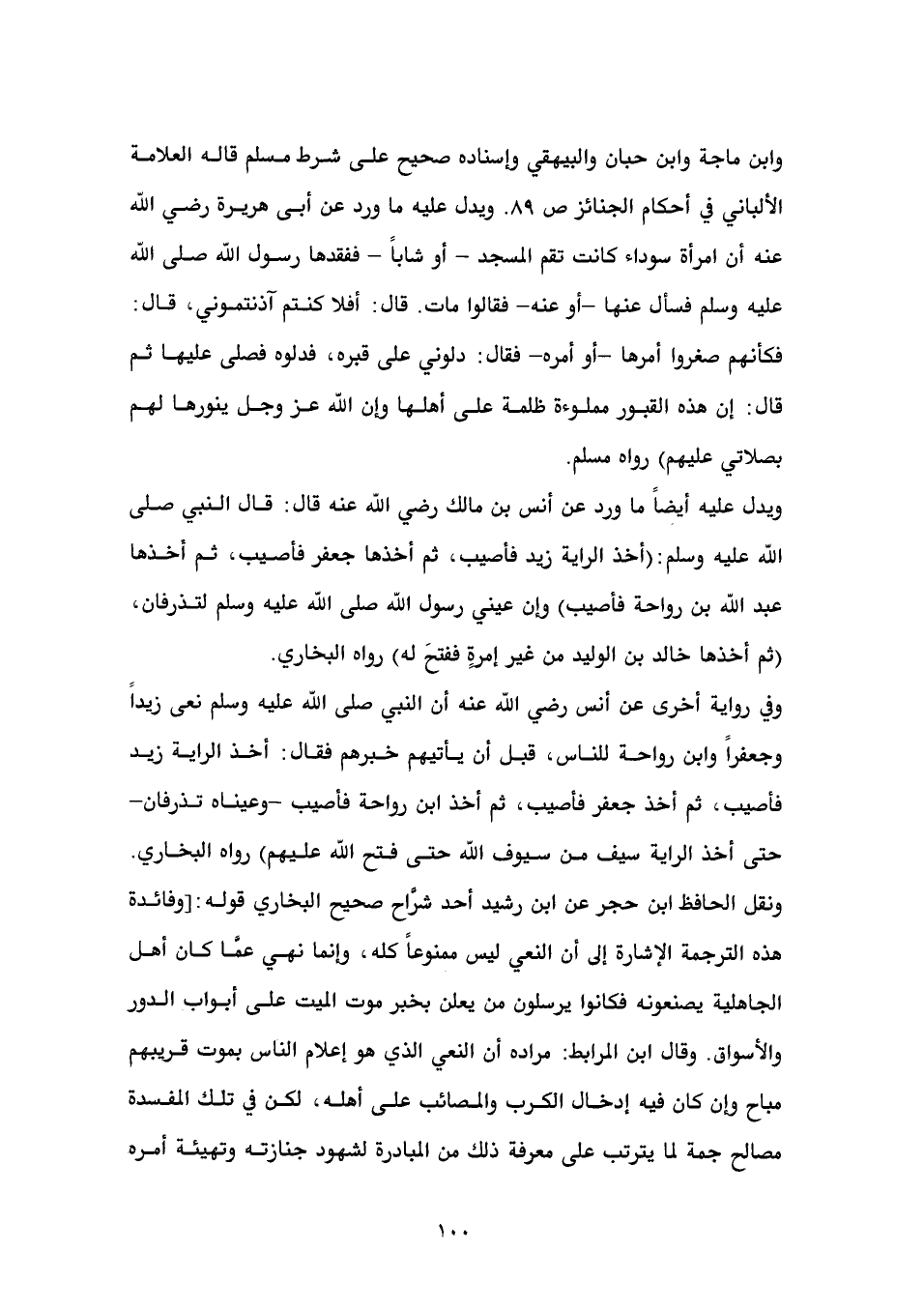 يأتيهم خبرهم فقال: أخذ الراية زيد فأصيب، ثم أخذ جعفر فأصيب، ثم أخذ ابن رواحة فأصيب -وعيناه تذرفان- حتى أخذ الراية سيف من سيوف الله حتى فتح الله عليهم) رواه البخاري. ونقل الحافظ ابن حجر عن ابن رشيد أحد شرَّاح صحيح البخاري قوله: [وفائدة هذه الترجمة الإشارة إلى أن النعي ليس ممنوعاً كله، وإنما نهي عمَّا كان أهل الجاهلية يصنعونه فكانوا يرسلون من يعلن بخبر موت الميت على أبواب الدور والأسواق. وقال ابن المرابط: مراده أن النعي الذي هو إعلام الناس بموت قريبهم مباح وإن كان فيه إدخال الكرب والمصائب على أهله، لكن في تلك المفسدة مصالح جمة لما يترتب على معرفة ذلك من المبادرة لشهود جنازته وتهيئة أمره