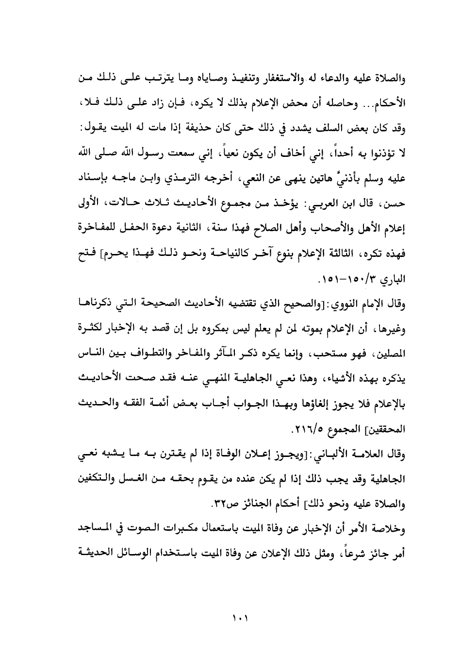 وقال العلامة الألباني: [ويجوز إعلان الوفاة إذا لم يقترن به ما يشبه نعي الجاهلية وقد يجب ذلك إذا لم يكن عنده من يقوم بحقه من الغسل والتكفين والصلاة عليه ونحو ذلك] أحكام الجنائز ص32.