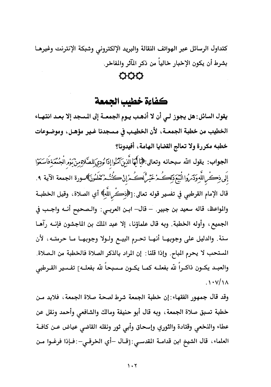 الجواب: يقول الله سبحانه وتعالى: {يَا أَيُّهَا الَّذِينَ آمَنُوا إِذَا نُودِيَ لِلصَّلاةِ مِنْ يَوْمِ الْجُمُعَةِ فَاسَعَوْا إِلَى ذِكْرِ اللَّهِ وَذَرُوا الْبَيْعَ ذَلِكُمْ خَيْرٌ لَكُمْ إِنْ كُنْتُمْ تَعْلَمُونَ} سورة الجمعة الآية 9. قال الإمام القرطبي في تفسير قوله تعالى: [{ذِكْرِ اللَّهِ} أي الصلاة، وقيل الخطبة والمواعظ، قاله سعيد بن جبير. - قال- ابن العربي: والصحيح أنه واجب في الجميع، وأوله الخطبة. وبه قال علماؤنا، إلا عبد الملك بن الماجشون فإنه رآها سنة. والدليل على وجوبها أنها تحرم البيع ولولا وجوبها ما حرمته، لأن المستحب لا يحرم المباح. وإذا قلنا: إن المراد بالذكر الصلاة فالخطبة من الصلاة. والعبد يكون ذاكراً لله بفعله كما يكون مسبحاً لله بفعله] تفسير القرطبي 18/ 107.