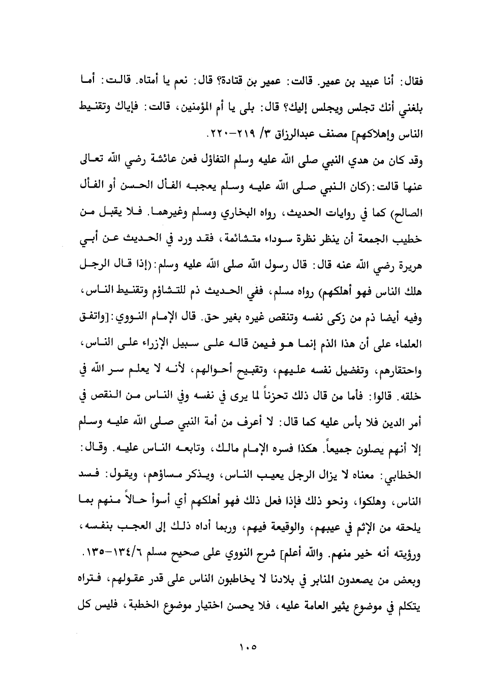 عنها قالت: (كان النبي صلى الله عليه وسلم يعجبه الفأل الحسن أو الفأل الصالح) كما في روايات الحديث، رواه البخاري ومسلم وغيرهما. فلا يقبل من خطيب الجمعة أن ينظر نظرة سوداء متشائمة، فقد ورد في الحديث عن أبي هريرة رضي الله عنه قال: قال رسول الله صلى الله عليه وسلم: (إذا قال الرجل هلك الناس فهو أهلكهم) رواه مسلم، ففي الحديث ذم للتشاؤم وتقنيط الناس، وفيه أيضا ذم من زكى نفسه وتنقص غيره بغير حق. قال الإمام النووي: [واتفق العلماء على أن هذا الذم إنما هو فيمن قاله على سبيل الإزراء على الناس، واحتقارهم، وتفضيل نفسه عليهم، وتقبيح أحوالهم، لأنه لا يعلم سر الله في خلقه. قالوا: فأما من قال ذلك تحزناً لما يرى في نفسه وفي الناس من النقص في أمر الدين فلا بأس عليه كما قال: لا أعرف من أمة النبي صلى الله عليه وسلم إلا أنهم يصلون جميعاً. هكذا فسره الإمام مالك، وتابعه الناس عليه. وقال: الخطابي: معناه لا يزال الرجل يعيب الناس، ويذكر مساؤهم، ويقول: فسد الناس، وهلكوا، ونحو ذلك فإذا فعل ذلك فهو أهلكهم أي أسوأ حالاً منهم بما يلحقه من الإثم في عيبهم، والوقيعة فيهم، وربما أداه ذلك إلى العجب بنفسه، ورؤيته أنه خير منهم. والله أعلم] شرح النووي على صحيح مسلم 6/ 134 - 135.