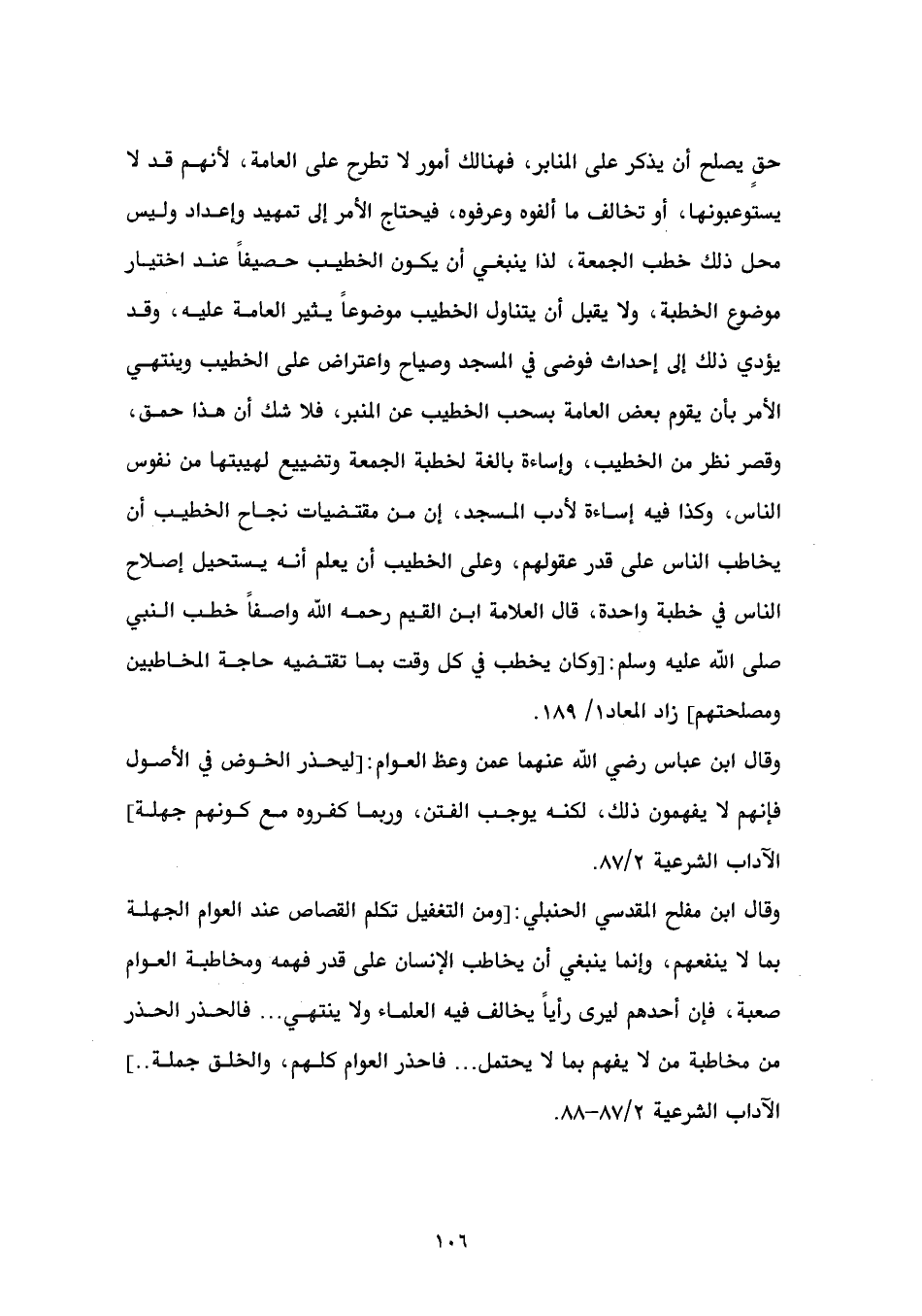 حقٍ يصلح أن يذكر على المنابر، فهنالك أمور لا تطرح على العامة، لأنهم قد لا يستوعبونها، أو تخالف ما ألفوه وعرفوه، فيحتاج الأمر إلى تمهيد وإعداد وليس محل ذلك خطب الجمعة، لذا ينبغي أن يكون الخطيب حصيفاً عند اختيار موضوع الخطبة، ولا يقبل أن يتناول الخطيب موضوعاً يثير العامة عليه، وقد يؤدي ذلك إلى إحداث فوضى في المسجد وصياح واعتراض على الخطيب وينتهي الأمر بأن يقوم بعض العامة بسحب الخطيب عن المنبر، فلا شك أن هذا حمق، وقصر نظر من الخطيب، وإساءة بالغة لخطبة الجمعة وتضييع لهيبتها من نفوس الناس، وكذا فيه إساءة لأدب المسجد، إن من مقتضيات نجاح الخطيب أن يخاطب الناس على قدر عقولهم، وعلى الخطيب أن يعلم أنه يستحيل إصلاح الناس في خطبة واحدة، قال العلامة ابن القيم رحمه الله واصفاً خطب النبي صلى الله عليه وسلم: [وكان يخطب في كل وقت بما تقتضيه حاجة المخاطبين ومصلحتهم] زاد المعاد1/ 189. وقال ابن