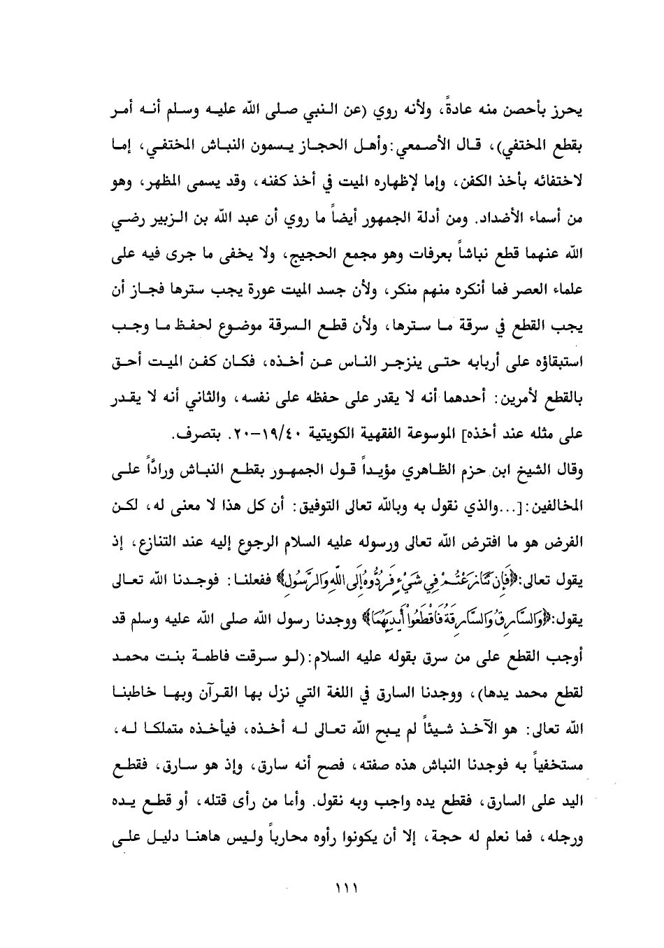لإظهاره الميت في أخذ كفنه، وقد يسمى المظهر، وهو من أسماء الأضداد. ومن أدلة الجمهور أيضاً ما روي أن عبد الله بن الزبير رضي الله عنهما قطع نباشاً بعرفات وهو مجمع الحجيج، ولا يخفى ما جرى فيه على علماء العصر فما أنكره منهم منكر، ولأن جسد الميت عورة يجب سترها فجاز أن يجب القطع في سرقة ما سترها، ولأن قطع السرقة موضوع لحفظ ما وجب استبقاؤه على أربابه حتى ينزجر الناس عن أخذه، فكان كفن الميت أحق بالقطع لأمرين: أحدهما أنه لا يقدر على حفظه على نفسه، والثاني أنه لا يقدر على مثله عند أخذه] الموسوعة الفقهية الكويتية 40/ 19 - 20. بتصرف. وقال الشيخ ابن حزم الظاهري مؤيداً قول الجمهور بقطع النباش ورادَّاً على المخالفين: [ ... والذي نقول به وبالله تعالى التوفيق: أن كل هذا لا معنى له، لكن الفرض هو ما افترض الله تعالى ورسوله عليه السلام الرجوع إليه عند التنازع، إذ يقول تعالى: {فَإِن تَنَازَعْتُمْ فِي شَيْءٍ فَرُدُّوهُ إِلَى اللهِ وَالرَّسُولِ} ففعلنا: فوجدنا الله تعالى يقول: {وَالسَّارِقُ وَالسَّارِقَةُ فَاقْطَعُواْ أَيْدِيَهُمَا} ووجدنا رسول الله صلى الله عليه وسلم قد أوجب القطع على من سرق بقوله عليه السلام: (لو سرقت فاطمة بنت محمد لقطع محمد يدها)، ووجدنا السارق في اللغة التي نزل بها القرآن وبها خاطبنا الله تعالى: هو الآخذ شيئاً لم يبح الله تعالى له أخذه، فيأخذه متملكا له، مستخفياً به فوجدنا النباش هذه صفته، فصح أنه سارق، وإذ هو سارق، فقطع اليد على السارق، فقطع يده واجب وبه نقول. وأما من رأى قتله، أو قطع يده ورجله، فما نعلم له حجة، إلا أن يكونوا رأوه محارباً وليس هاهنا دليل على