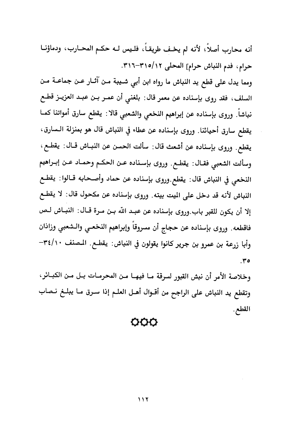 أنه محارب أصلاً؛ لأنه لم يخف طريقاً، فليس له حكم المحارب، ودماؤنا حرام، فدم النباش حرام] المحلى 12/ 315 - 316. ومما يدل على قطع يد النباش ما رواه ابن أبي شيبة من آثار عن جماعة من السلف، فقد روى بإسناده عن معمر قال: بلغني أن عمر بن عبد العزيز قطع نباشاً. وروى بإسناده عن إبراهيم النخعي والشعبي قالا: