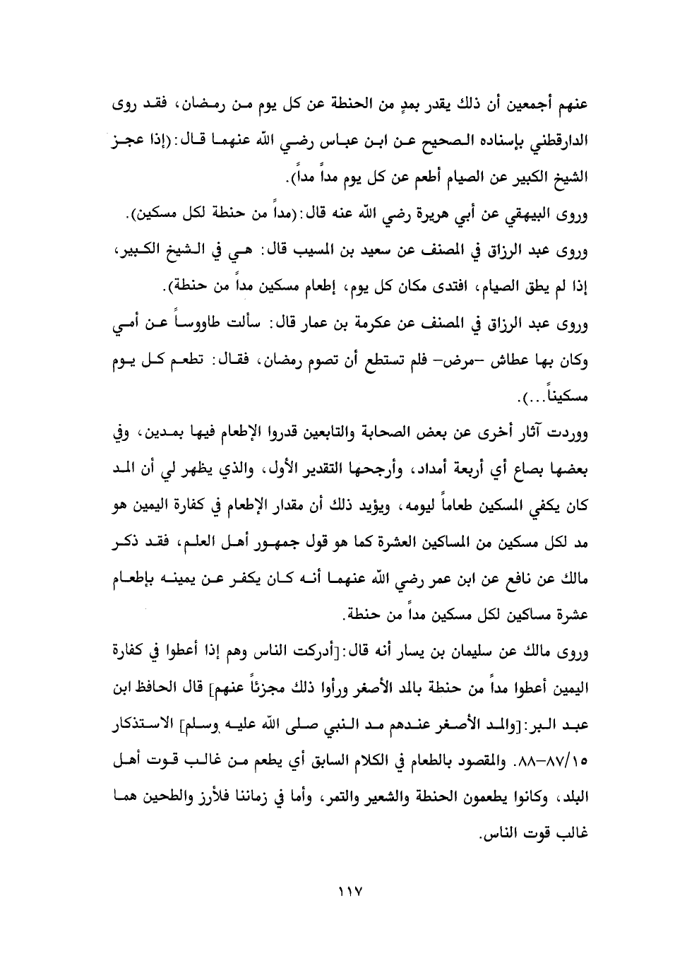 ووردت آثار أخرى عن بعض الصحابة والتابعين قدروا الإطعام فيها بمدين، وفي بعضها بصاع أي أربعة أمداد، وأرجحها التقدير الأول، والذي يظهر لي أن المد كان يكفي المسكين طعاماً ليومه، ويؤيد ذلك أن مقدار الإطعام في كفارة اليمين هو مد لكل مسكين من المساكين العشرة كما هو قول جمهور أهل العلم، فقد ذكر مالك عن نافع عن ابن عمر رضي الله عنهما أنه كان يكفر عن يمينه بإطعام عشرة مساكين لكل مسكين مداً من حنطة.