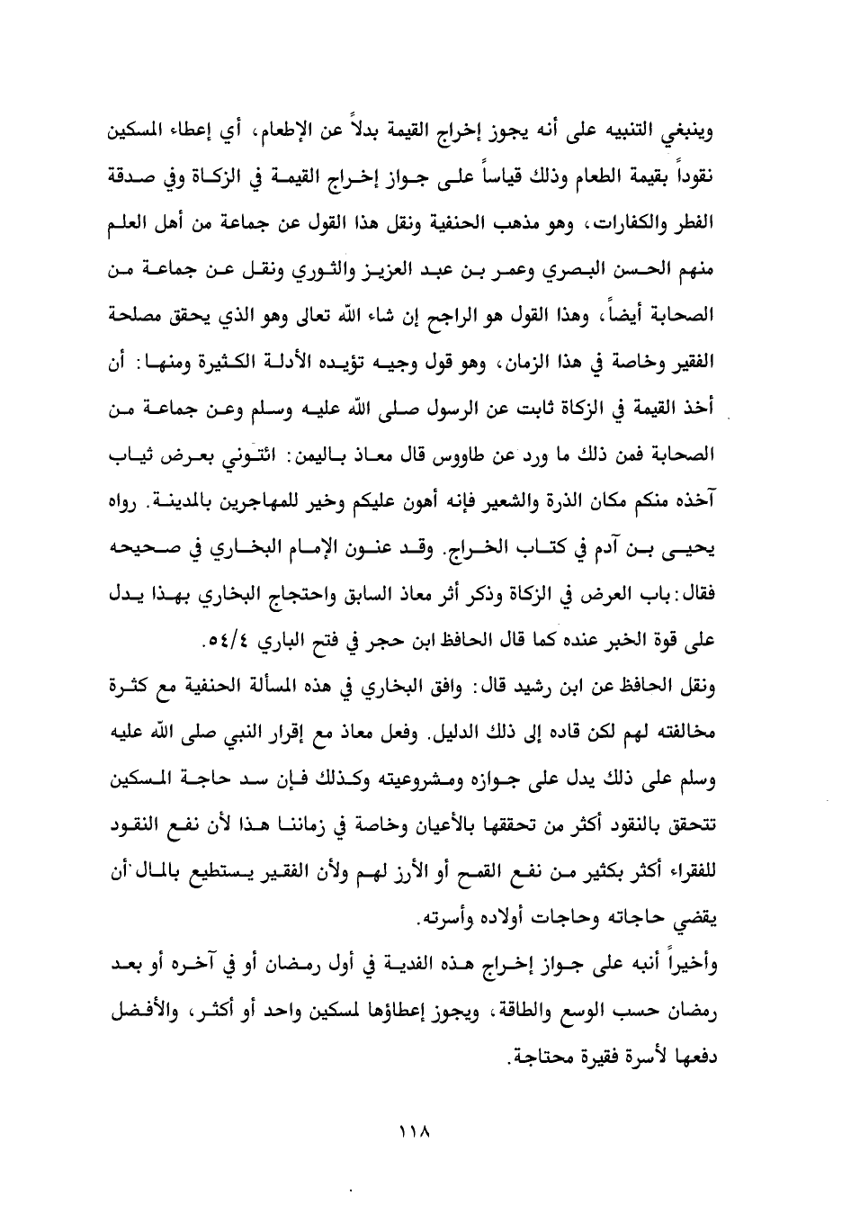 واحتجاج البخاري بهذا يدل على قوة الخبر عنده كما قال الحافظ ابن حجر في فتح الباري 4/ 54. ونقل الحافظ عن ابن رشيد قال: وافق البخاري في هذه المسألة الحنفية مع كثرة مخالفته لهم لكن قاده إلى ذلك الدليل. وفعل معاذ مع إقرار النبي صلى الله عليه وسلم على ذلك يدل على جوازه ومشروعيته وكذلك فإن سد حاجة المسكين تتحقق بالنقود أكثر من تحققها بالأعيان وخاصة في زماننا هذا لأن نفع النقود للفقراء أكثر بكثير من نفع القمح أو الأرز لهم ولأن الفقير يستطيع بالمال أن يقضي حاجاته وحاجات أولاده وأسرته.