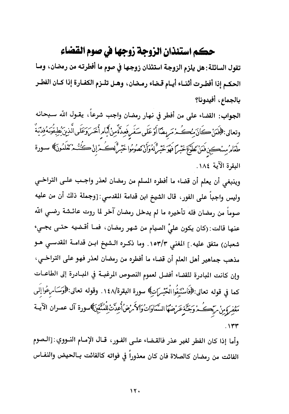 تقول السائلة: هل يلزم الزوجة استئذان زوجها في صوم ما أفطرته من رمضان، وما الحكم إذا أفطرت أثناء أيام قضاء رمضان، وهل تلزم الكفارة إذا كان الفطر بالجماع، أفيدونا؟