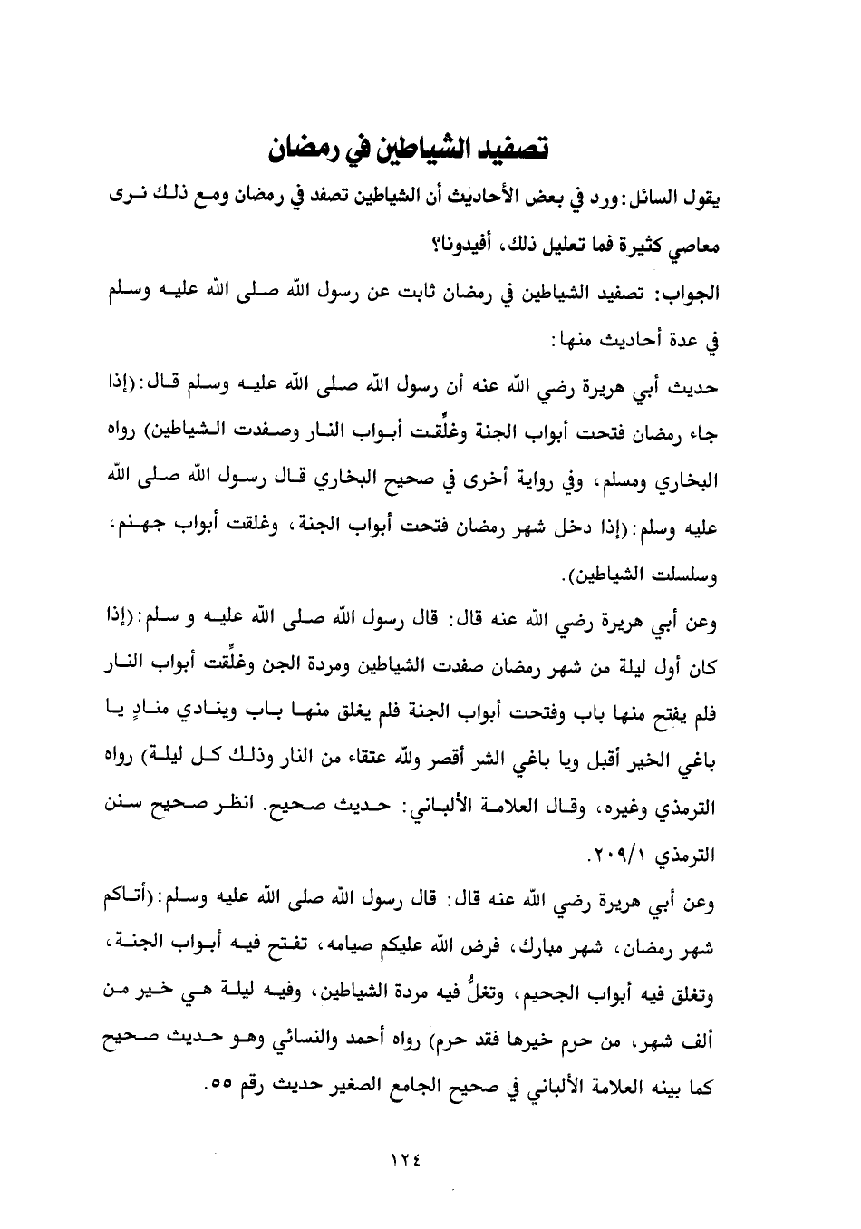 وعن أبي هريرة رضي الله عنه قال: قال رسول الله صلى الله عليه وسلم: (إذا كان أول ليلة من شهر رمضان صفدت الشياطين ومردة الجن وغلِّقت أبواب النار فلم يفتح منها باب وفتحت أبواب الجنة فلم يغلق منها باب وينادي منادٍ يا باغي الخير أقبل ويا باغي الشر أقصر ولله عتقاء من النار وذلك كل ليلة) رواه الترمذي وغيره، وقال العلامة الألباني: حديث صحيح. انظر صحيح سنن الترمذي 1/ 209.