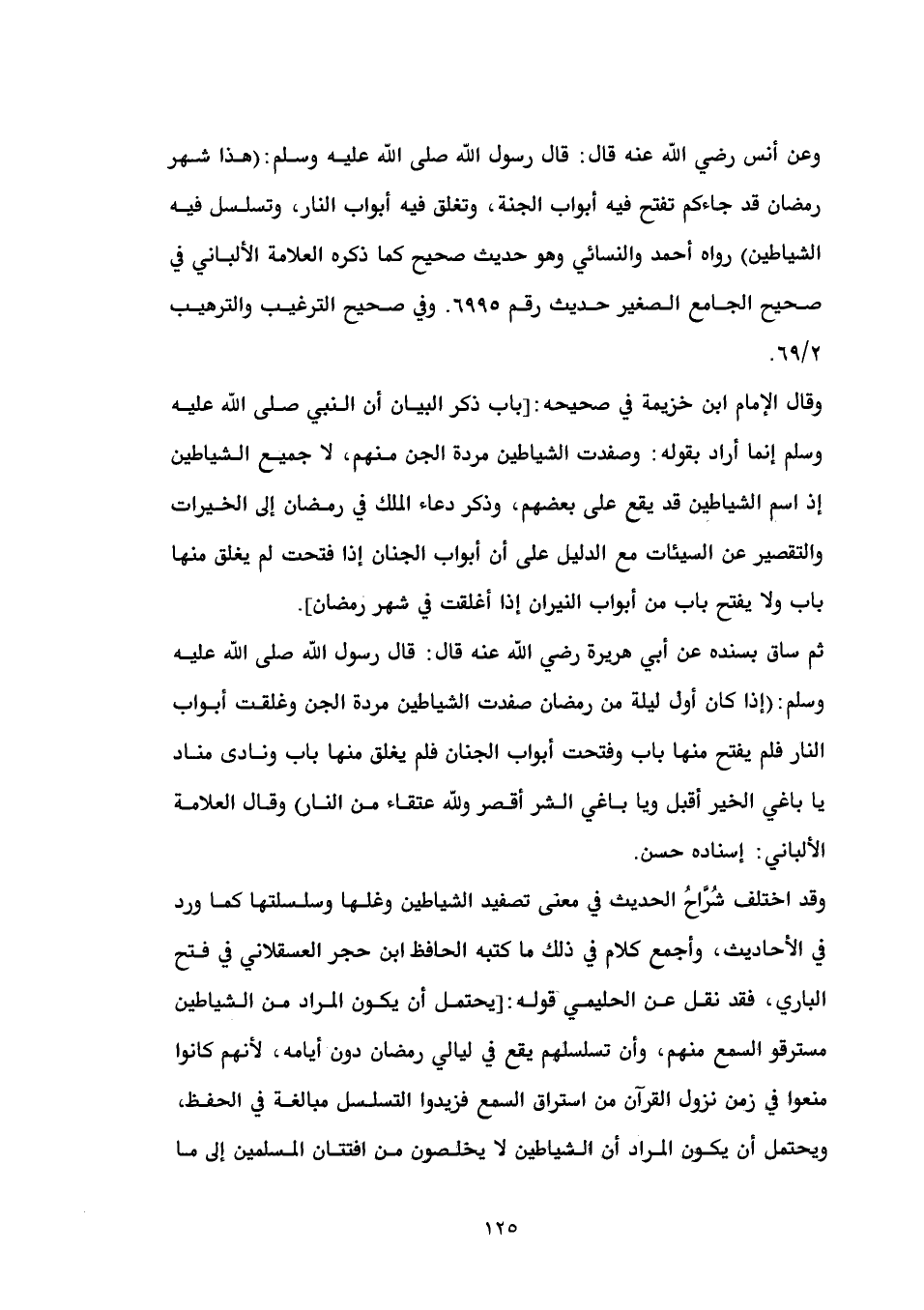 وقال الإمام ابن خزيمة في صحيحه: [باب ذكر البيان أن النبي صلى الله عليه وسلم إنما أراد بقوله: وصفدت الشياطين مردة الجن منهم، لا جميع الشياطين إذ اسم الشياطين قد يقع على بعضهم، وذكر دعاء الملك في رمضان إلى الخيرات والتقصير عن السيئات مع الدليل على أن أبواب الجنان إذا فتحت لم يغلق منها باب ولا يفتح باب من أبواب النيران إذا أغلقت في شهر رمضان. ثم ساق بسنده عن أبي