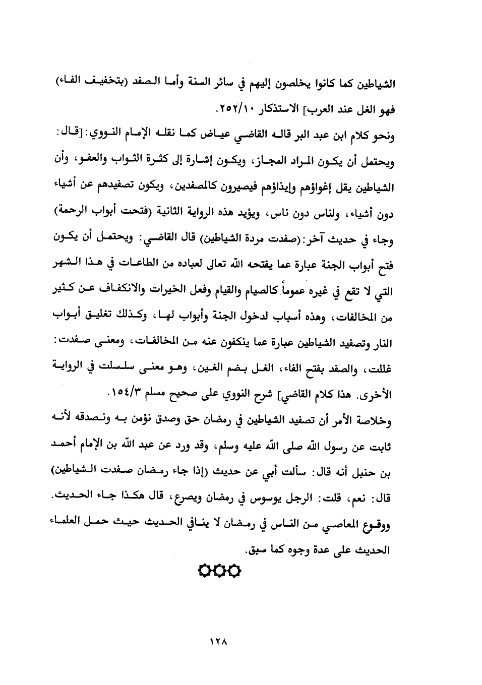 ونحو كلام ابن عبد البر قاله القاضي عياض كما نقله الإمام النووي: [قال: ويحتمل أن يكون المراد المجاز، ويكون إشارة إلى كثرة الثواب والعفو، وأن الشياطين يقل إغواؤهم وإيذاؤهم فيصيرون كالمصفدين، ويكون تصفيدهم عن أشياء دون أشياء، ولناس دون ناس، ويؤيد هذه الرواية الثانية (فتحت أبواب الرحمة) وجاء في حديث آخر: (صفدت مردة الشياطين) قال القاضي: ويحتمل أن يكون فتح أبواب الجنة عبارة عما يفتحه الله تعالى لعباده من الطاعات في هذا الشهر التي لا تقع في غيره عموماً كالصيام والقيام وفعل الخيرات والانكفاف عن كثير من المخالفات، وهذه أسباب لدخول الجنة وأبواب لها، وكذلك تغليق أبواب النار وتصفيد الشياطين عبارة عما ينكفون عنه من المخالفات، ومعنى صفدت: غللت، والصفد بفتح الفاء، الغل بضم الغين، وهو معنى سلسلت في الرواية الأخرى. هذا كلام القاضي] شرح النووي على صحيح مسلم 3/ 154.