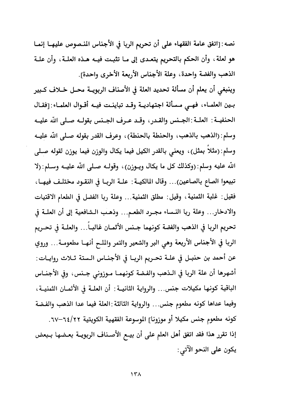 نصه: [اتفق عامة الفقهاء على أن تحريم الربا في الأجناس المنصوص عليها إنما هو لعلة، وأن الحكم بالتحريم يتعدى إلى ما تثبت فيه هذه العلة، وأن علة الذهب والفضة واحدة، وعلة