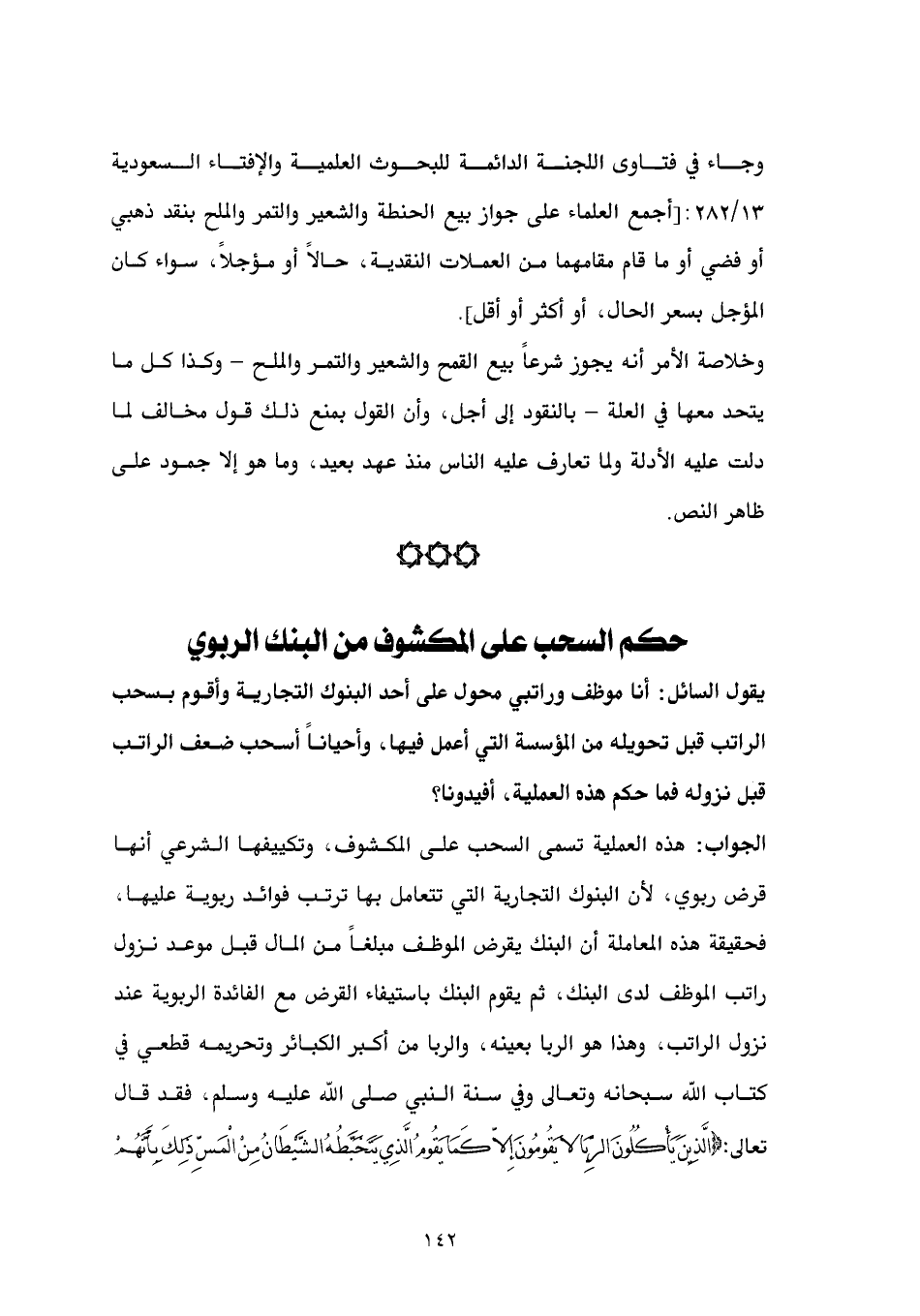 وخلاصة الأمر أنه يجوز شرعاً بيع القمح والشعير والتمر والملح - وكذا كل ما يتحد معها في العلة - بالنقود إلى أجل، وأن القول بمنع ذلك قول مخالف لما دلت عليه الأدلة ولما تعارف عليه الناس منذ عهد بعيد، وما هو إلا جمود على ظاهر النص.