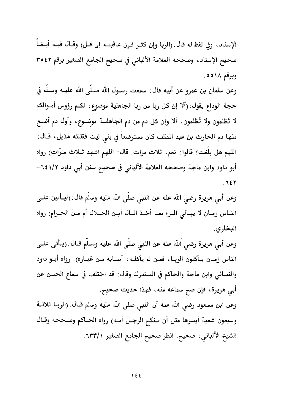 وعن سلمان بن عمرو عن أبيه قال: سمعت رسول الله صلّى الله عليه وسلّم في حجة الوداع يقول: (ألا إن كل ربا من ربا الجاهلية موضوع، لكم رؤوس أموالكم لا تَظلمون ولا تُظلمون، ألا وإن كل دم من دم الجاهلية موضوع، وأول دم أضع منها دم الحارث بن عبد المطلب كان مسترضعاً في بني ليث فقتلته هذيل، قال: اللهم هل بلّغت؟ قالوا: نعم، ثلاث مرات. قال: اللهم اشهد ثلاث مرّات) رواه أبو داود وابن ماجة وصححه العلامة الألباني في صحيح سنن أبي داود 2/ 641 - 642.