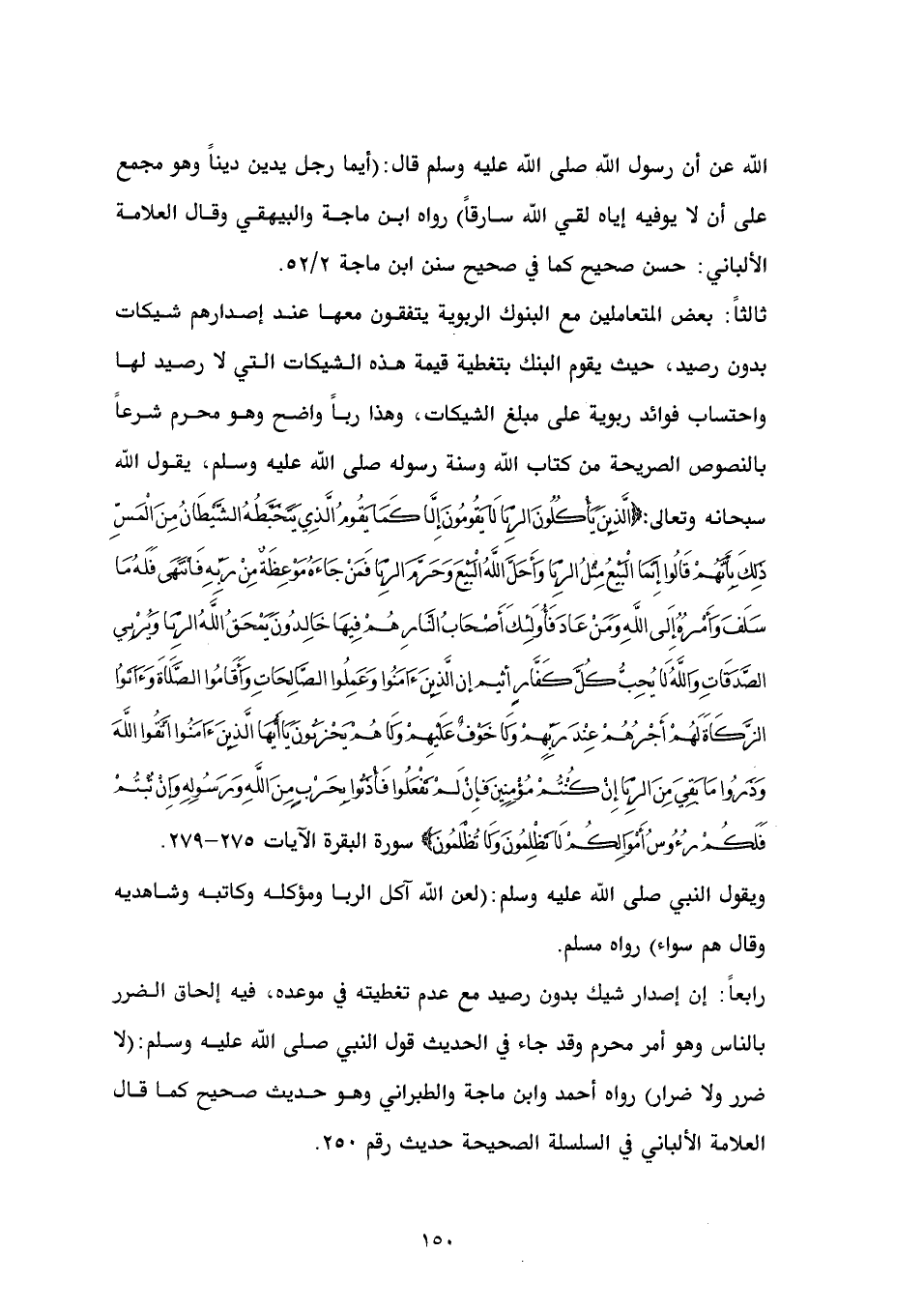 ثالثاً: بعض المتعاملين مع البنوك الربوية يتفقون معها عند إصدارهم شيكات بدون رصيد، حيث يقوم البنك بتغطية قيمة هذه الشيكات التي لا رصيد لها واحتساب فوائد ربوية على مبلغ الشيكات، وهذا رباً واضح وهو محرم شرعاً بالنصوص الصريحة من كتاب الله وسنة رسوله صلى الله عليه وسلم، يقول الله سبحانه وتعالى: (الَّذِينَ يَأْكُلُونَ الرِّبَا لَا يَقُومُونَ إِلَّا كَمَا يَقُومُ الَّذِي يَتَخَبَّطُهُ الشَّيْطَانُ مِنَ الْمَسِّ ذَلِكَ بِأَنَّهُمْ قَالُوا إِنَّمَا الْبَيْعُ مِثْلُ الرِّبَا وَأَحَلَّ اللَّهُ الْبَيْعَ وَحَرَّمَ الرِّبَا فَمَنْ جَاءَهُ مَوْعِظَةٌ مِنْ رَبِّهِ فَانْتَهَى فَلَهُ مَا سَلَفَ وَأَمْرُهُ إِلَى اللَّهِ وَمَنْ عَادَ فَأُولَئِكَ أَصْحَابُ النَّارِ هُمْ فِيهَا خَالِدُونَ يَمْحَقُ اللَّهُ الرِّبَا وَيُرْبِي الصَّدَقَاتِ وَاللَّهُ لَا يُحِبُّ كُلَّ كَفَّارٍ أثيم إن الَّذِينَءَامَنُوا وَعَمِلُوا الصَّالِحَاتِ وَأَقَامُوا الصَّلَاةَ وَءَاتَوُا الزَّكَاةَ لَهُمْ أَجْرُهُمْ عِنْدَ رَبِّهِمْ وَلَا خَوْفٌ عَلَيْهِمْ وَلَا هُمْ يَحْزَنُونَ يَاأَيُّهَا الَّذِينَءَامَنُوا اتَّقُوا اللَّهَ وَذَرُوا مَا بَقِيَ مِنَ الرِّبَا إِنْ كُنْتُمْ مُؤْمِنِين َفإِنْ لَمْ تَفْعَلُوا فَأْذَنُوا بِحَرْبٍ مِنَ اللَّهِ وَرَسُولِهِ وَإِنْ تُبْتُمْ فَلَكُمْ رُءُوسُ أَمْوَالِكُمْ لَا تَظْلِمُونَ وَلَا تُظْلَمُونَ (سورة البقرة الآيات 275 - 279. ويقول النبي صلى الله عليه وسلم: (لعن الله آكل الربا ومؤكله وكاتبه وشاهديه وقال هم سواء) رواه مسلم.