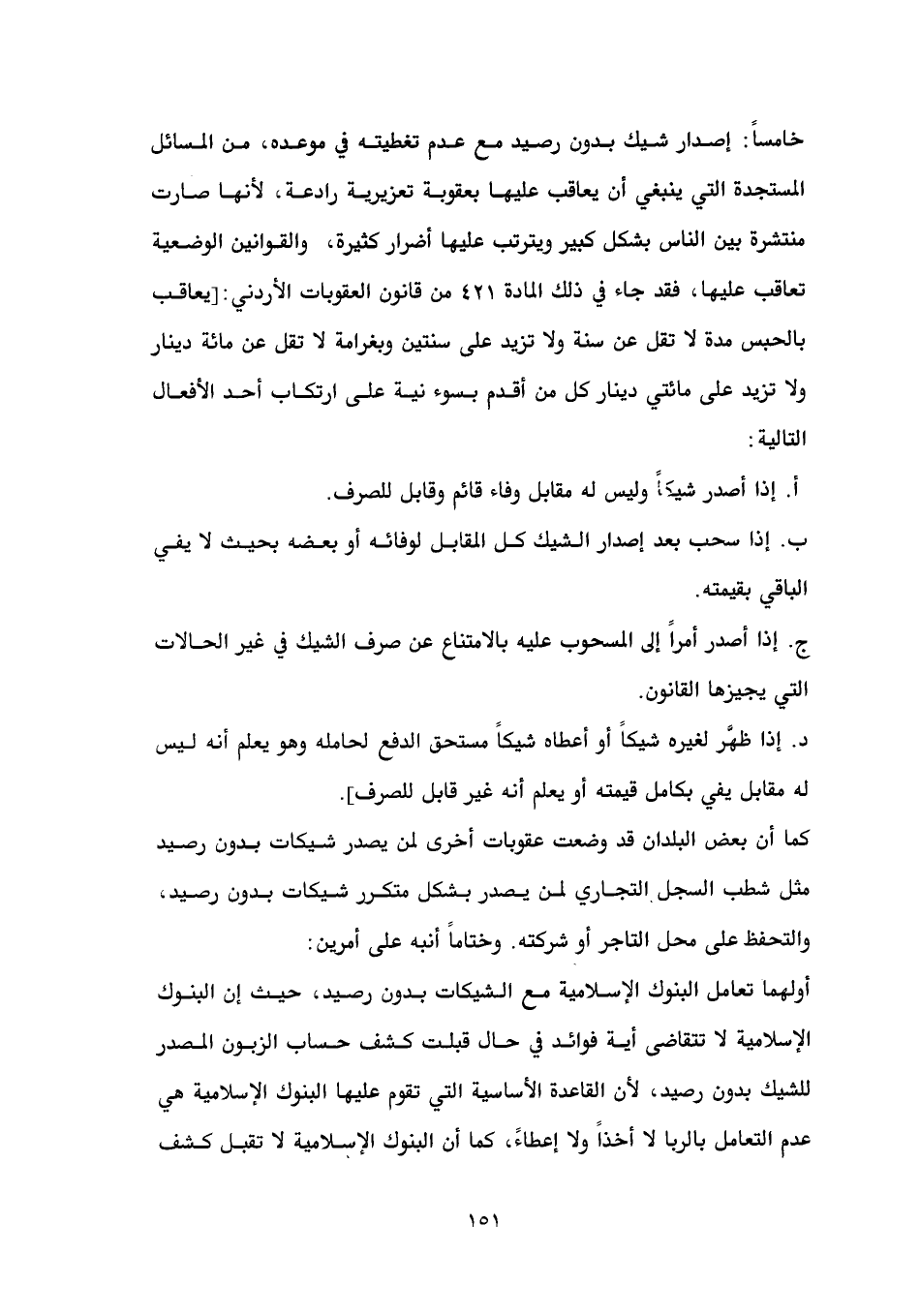 خامساً: إصدار شيك بدون رصيد مع عدم تغطيته في موعده، من المسائل المستجدة التي ينبغي أن يعاقب عليها بعقوبة تعزيرية رادعة، لأنها صارت منتشرة بين الناس بشكل كبير ويترتب عليها أضرار كثيرة، والقوانين الوضعية تعاقب عليها، فقد جاء في ذلك المادة 421 من قانون العقوبات الأردني: [يعاقب بالحبس مدة لا تقل عن سنة ولا تزيد على سنتين وبغرامة لا تقل عن مائة دينار ولا تزيد على مائتي دينار كل من أقدم بسوء نية على ارتكاب أحد الأفعال التالية: