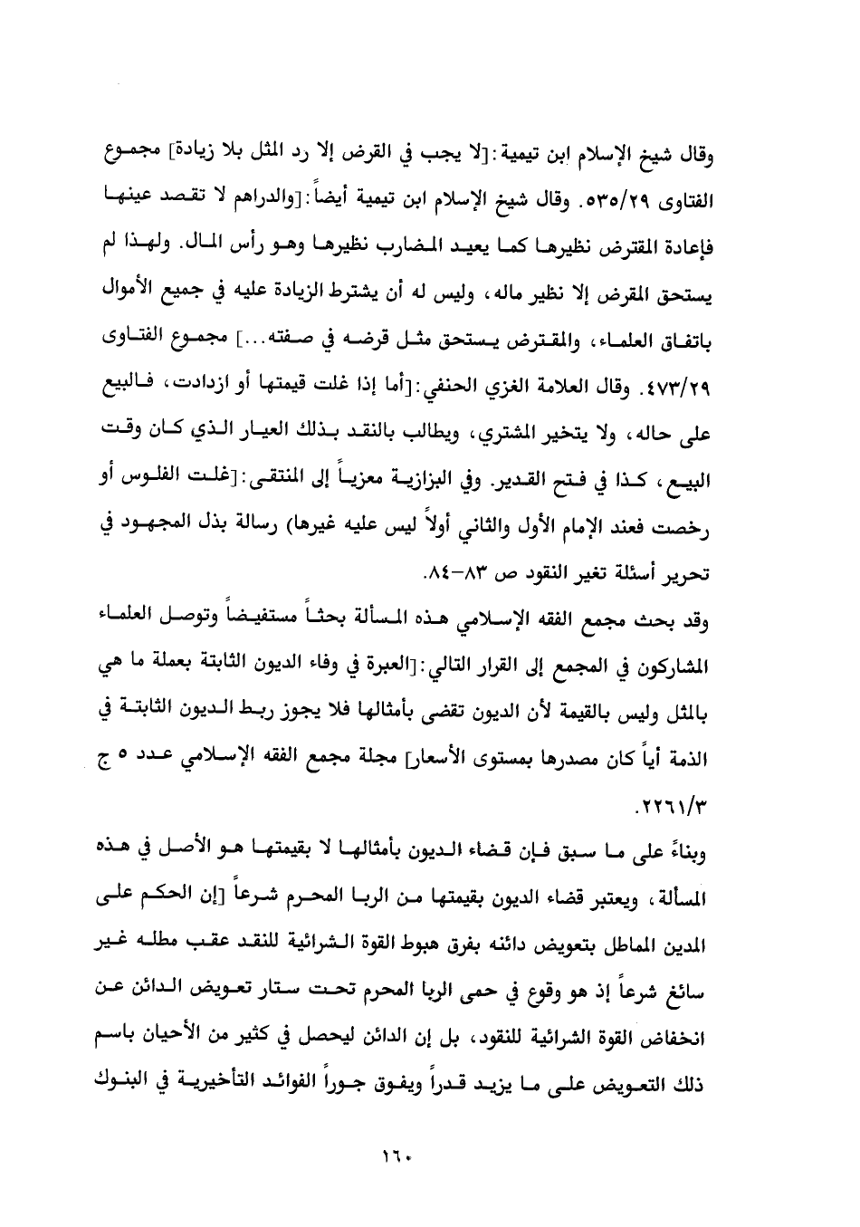 وقال شيخ الإسلام ابن تيمية: [لا يجب في القرض إلا رد المثل بلا زيادة] مجموع الفتاوى 29/ 535. وقال شيخ الإسلام ابن تيمية أيضاً: [والدراهم لا تقصد عينها فإعادة المقترض نظيرها كما يعيد المضارب نظيرها وهو رأس المال. ولهذا لم يستحق المقرض إلا نظير ماله، وليس له أن يشترط الزيادة عليه في جميع الأموال باتفاق العلماء، والمقترض يستحق مثل قرضه في صفته ... ] مجموع الفتاوى 29/ 473. وقال العلامة الغزي الحنفي: [أما إذا غلت قيمتها أو ازدادت، فالبيع على حاله، ولا يتخير المشتري، ويطالب بالنقد بذلك العيار الذي كان وقت البيع، كذا في فتح القدير. وفي البزازية معزياً إلى المنتقى: [غلت الفلوس أو رخصت فعند الإمام الأول والثاني أولاً ليس عليه غيرها) رسالة بذل المجهود في تحرير أسئلة تغير النقود ص 83 - 84. وقد بحث مجمع الفقه الإسلامي هذه المسألة بحثاً مستفيضاً وتوصل العلماء المشاركون في المجمع إلى القرار التالي: [العبرة في وفاء الديون الثابتة بعملة ما هي بالمثل وليس بالقيمة لأن الديون تقضى بأمثالها فلا يجوز ربط الديون الثابتة في الذمة أياً كان مصدرها بمستوى الأسعار] مجلة مجمع الفقه الإسلامي عدد 5 ج 3/ 2261. وبناءً على ما سبق فإن قضاء الديون بأمثالها لا بقيمتها هو الأصل في هذه المسألة، ويعتبر قضاء