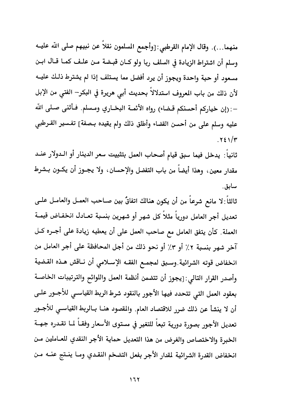 ثالثاً: لا مانع شرعاً من أن يكون هنالك اتفاقٌ بين صاحب العمل والعامل على تعديل أجر العامل دورياً مثلاً كل شهر أو شهرين بنسبة تعادل انخفاض قيمة العملة. كأن يتفق العامل مع صاحب العمل على أن يعطيه زيادة على أجره كل آخر شهر بنسبة 2% أو 3% أو نحو ذلك من أجل المحافظة على أجر العامل من انخفاض قوته الشرائية. وسبق لمجمع الفقه الإسلامي أن ناقش هذه القضية وأصدر القرار التالي: [يجوز أن تتضمن أنظمة العمل واللوائح والترتيبات الخاصة بعقود العمل التي تتحدد فيها الأجور بالنقود شرط الربط القياسي للأجور على أن لا ينشأ عن ذلك ضرر للاقتصاد العام. والمقصود هنا بالربط القياسي للأجور تعديل الأجور بصورة دورية تبعاً للتغير في مستوى الأسعار وفقاً لما تقدره جهة الخبرة والاختصاص والغرض من هذا التعديل حماية الأجر النقدي للعاملين من انخفاض القدرة الشرائية لمقدار الأجر بفعل التضخم النقدي وما ينتج عنه من