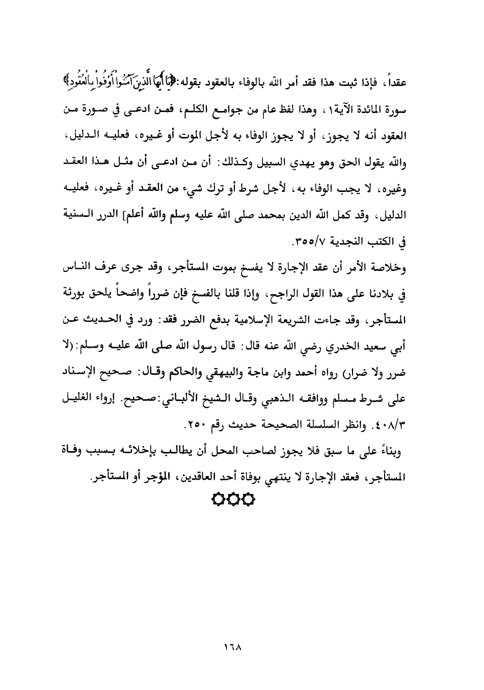 عقداً، فإذا ثبت هذا فقد أمر الله بالوفاء بالعقود بقوله: (يَا أَيُّهَا الَّذِينَ آمَنُواْ أَوْفُواْ بِالْعُقُودِ (سورة المائدة الآية1، وهذا لفظ عام من جوامع الكلم، فمن ادعى في صورة من العقود أنه لا يجوز، أو لا يجوز الوفاء به لأجل الموت أو غيره، فعليه الدليل، والله يقول الحق وهو يهدي السبيل وكذلك: أن من ادعى أن مثل هذا العقد وغيره، لا يجب الوفاء به، لأجل شرط أو ترك شيء من العقد أو غيره، فعليه الدليل، وقد كمل الله الدين بمحمد صلى الله عليه وسلم والله أعلم] الدرر السنية في الكتب النجدية 7/ 355.