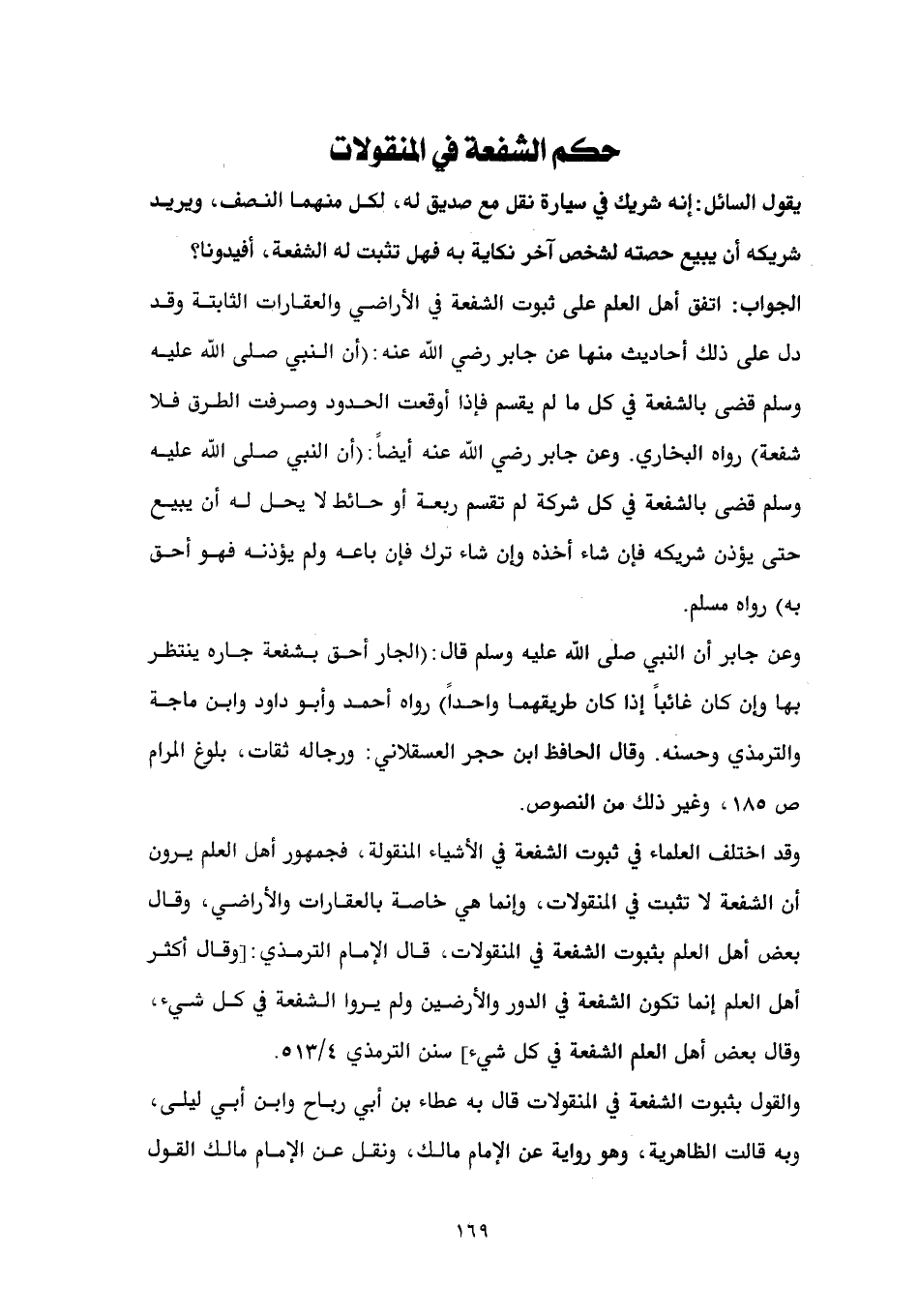 الجواب: اتفق أهل العلم على ثبوت الشفعة في الأراضي والعقارات الثابتة وقد دل على ذلك أحاديث منها عن جابر رضي الله عنه: (أن النبي صلى الله عليه وسلم قضى بالشفعة في كل ما لم يقسم فإذا أوقعت الحدود وصرفت الطرق فلا شفعة) رواه البخاري. وعن جابر رضي الله عنه أيضاً: (أن النبي صلى الله عليه وسلم قضى بالشفعة في كل شركة لم تقسم ربعة أو حائط لا يحل له أن يبيع حتى يؤذن شريكه فإن شاء أخذه وإن شاء ترك فإن باعه ولم يؤذنه فهو أحق به) رواه مسلم. وعن جابر أن النبي صلى الله عليه وسلم قال: (الجار أحق بشفعة جاره ينتظر بها وإن كان غائباً إذا كان طريقهما واحداً) رواه أحمد وأبو داود وابن ماجة والترمذي وحسنه. وقال الحافظ ابن حجر العسقلاني: ورجاله ثقات، بلوغ المرام ص 185، وغير ذلك من النصوص. وقد اختلف العلماء في ثبوت الشفعة في الأشياء المنقولة، فجمهور أهل العلم يرون أن الشفعة لا تثبت في المنقولات، وإنما هي خاصة بالعقارات والأراضي، وقال بعض أهل العلم بثبوت الشفعة في المنقولات، قال الإمام الترمذي: [وقال أكثر أهل العلم إنما تكون الشفعة في الدور والأرضين ولم يروا الشفعة في كل شيء، وقال بعض أهل العلم الشفعة في كل شيء] سنن الترمذي 4/ 513. والقول بثبوت الشفعة في المنقولات قال به عطاء بن أبي رباح وابن أبي ليلى، وبه قالت الظاهرية، وهو رواية عن الإمام مالك، ونقل عن الإمام مالك القول