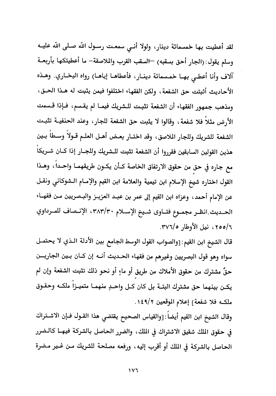 قال الشيخ ابن القيم: [والصواب القول الوسط الجامع بين الأدلة الذي لا يحتمل سواه وهو قول البصريين وغيرهم من فقهاء الحديث أنه إن كان بين الجارين حقٌ مشترك من حقوق الأملاك من طريقٍ أو ماء أو نحو ذلك تثبت الشفعة وإن لم يكن بينهما حق مشترك البتة بل كان كل واحدٍ منهما متميزاً ملكه وحقوق ملكه فلا شفعة] إعلام الموقعين 2/ 149. وقال الشيخ ابن القيم أيضاً: [والقياس الصحيح يقتضي هذا القول فإن الاشتراك في حقوق الملك شقيق الاشتراك في الملك، والضرر الحاصل بالشركة فيها كالضرر الحاصل بالشركة في الملك أو أقرب إليه، ورفعه مصلحة للشريك من غير مضرة