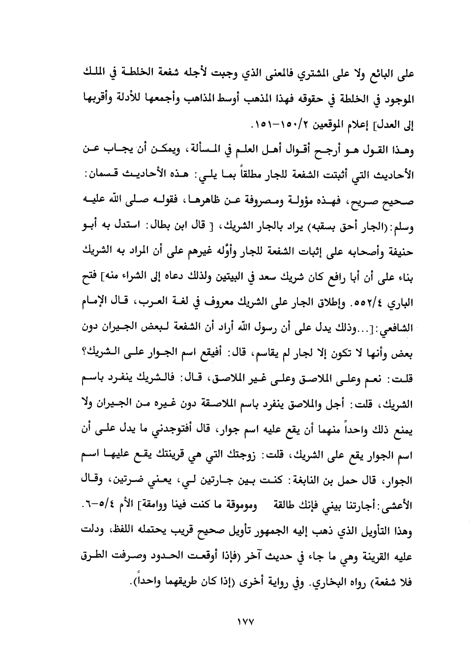 وهذا القول هو أرجح أقوال أهل العلم في المسألة، ويمكن أن يجاب عن الأحاديث التي أثبتت الشفعة للجار مطلقاً بما يلي: هذه الأحاديث قسمان: صحيح صريح، فهذه مؤولة ومصروفة عن ظاهرها، فقوله صلى الله عليه وسلم: (الجار أحق بسقبه) يراد بالجار الشريك، [قال ابن بطال: استدل به أبو حنيفة وأصحابه على إثبات الشفعة للجار وأوَّله غيرهم على أن المراد به الشريك بناء على أن أبا رافع كان شريك سعد في البيتين ولذلك دعاه إلى الشراء منه] فتح الباري 4/ 552. وإطلاق الجار على الشريك معروف في لغة العرب، قال الإمام الشافعي: [ ... وذلك يدل على أن رسول الله أراد أن الشفعة لبعض الجيران دون بعض وأنها لا تكون إلا لجار لم يقاسم، قال: أفيقع اسم الجوار على الشريك؟ قلت: نعم وعلى الملاصق وعلى غير الملاصق، قال: فالشريك ينفرد باسم الشريك، قلت: أجل والملاصق ينفرد باسم الملاصقة دون غيره من الجيران ولا يمنع ذلك واحداً منهما أن يقع عليه اسم جوار، قال أفتوجدني ما يدل على أن اسم الجوار يقع على الشريك، قلت: زوجتك التي هي