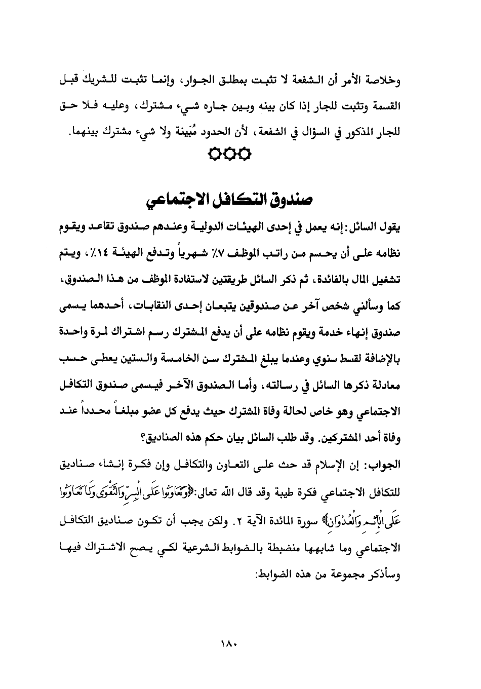 الجواب: إن الإسلام قد حث على التعاون والتكافل وإن فكرة إنشاء صناديق للتكافل الاجتماعي فكرة طيبة وقد قال الله تعالى: {وَتَعَاوَنُوا عَلَى الْبِرِّ وَالتَّقْوَى وَلَا تَعَاوَنُوا عَلَى الْإِثْمِ وَالْعُدْوَانِ} سورة المائدة الآية 2. ولكن يجب أن تكون صناديق التكافل الاجتماعي وما شابهها منضبطة بالضوابط الشرعية لكي يصح الاشتراك فيها وسأذكر مجموعة من هذه الضوابط:
