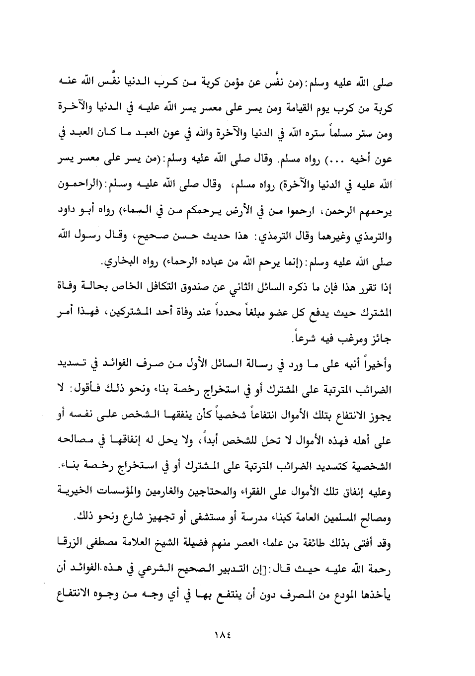 وأخيراً أنبه على ما ورد في رسالة السائل الأول من صرف الفوائد في تسديد الضرائب المترتبة على المشترك أو في استخراج رخصة بناء ونحو ذلك فأقول: لا يجوز الانتفاع بتلك الأموال انتفاعاً شخصياً كأن ينفقها الشخص على نفسه أو على أهله فهذه الأموال لا تحل للشخص أبداً، ولا يحل له إنفاقها في مصالحه الشخصية كتسديد الضرائب المترتبة على المشترك أو في استخراج رخصة بناء. وعليه إنفاق تلك الأموال على الفقراء والمحتاجين والغارمين والمؤسسات الخيرية ومصالح المسلمين العامة كبناء مدرسة أو مستشفى أو تجهيز شارع ونحو ذلك. وقد أفتى بذلك طائفة من علماء العصر منهم فضيلة الشيخ العلامة مصطفى الزرقا رحمة الله عليه حيث قال: [إن التدبير الصحيح الشرعي في هذه الفوائد أن يأخذها المودع من المصرف دون أن ينتفع بها في أي وجه من وجوه الانتفاع