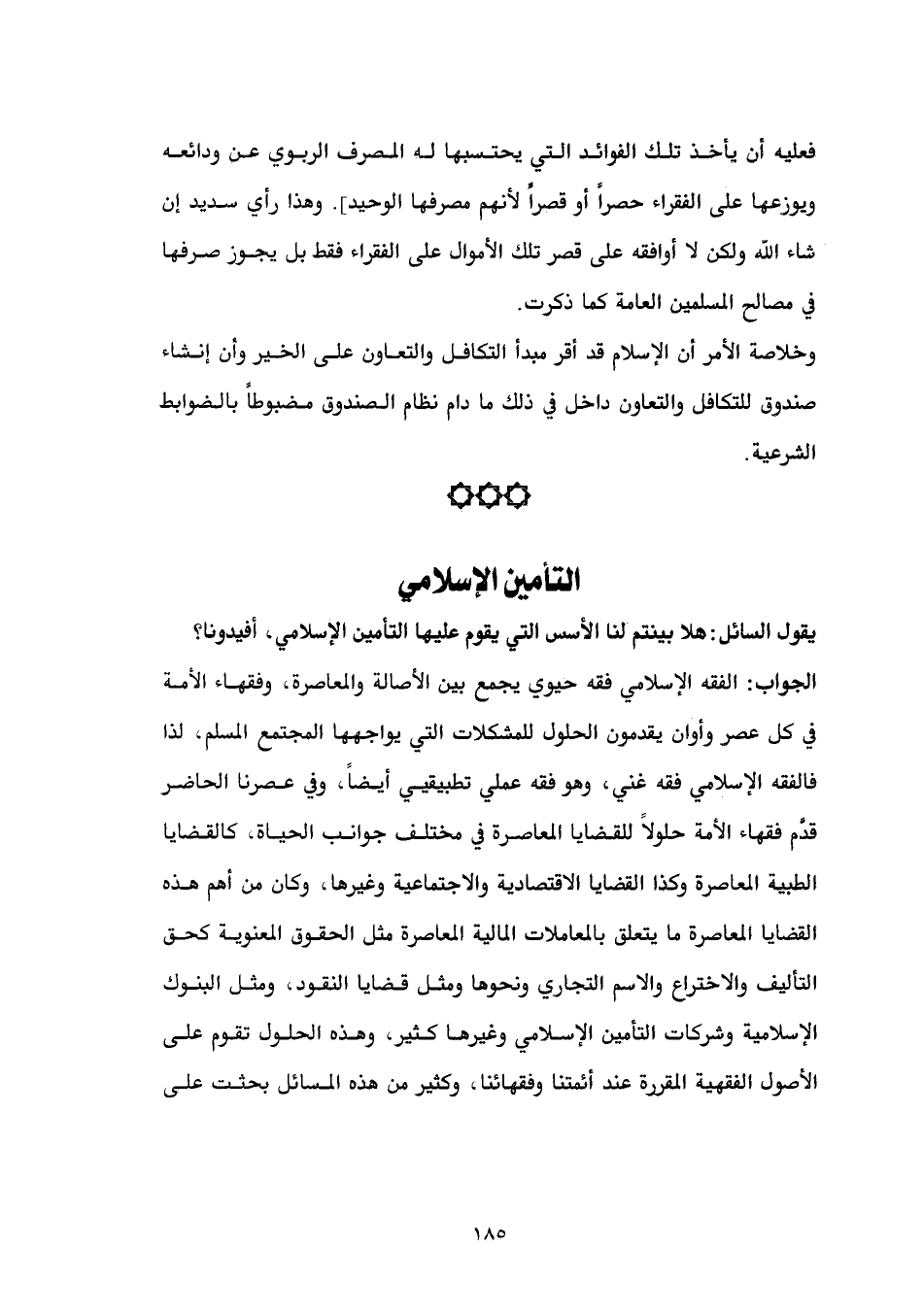 فعليه أن يأخذ تلك الفوائد التي يحتسبها له المصرف الربوي عن ودائعه ويوزعها على الفقراء حصراً أو قصراً لأنهم مصرفها الوحيد]. وهذا رأي سديد إن شاء الله ولكن لا أوافقه على قصر تلك الأموال على الفقراء فقط بل يجوز صرفها في مصالح المسلمين العامة كما ذكرت.