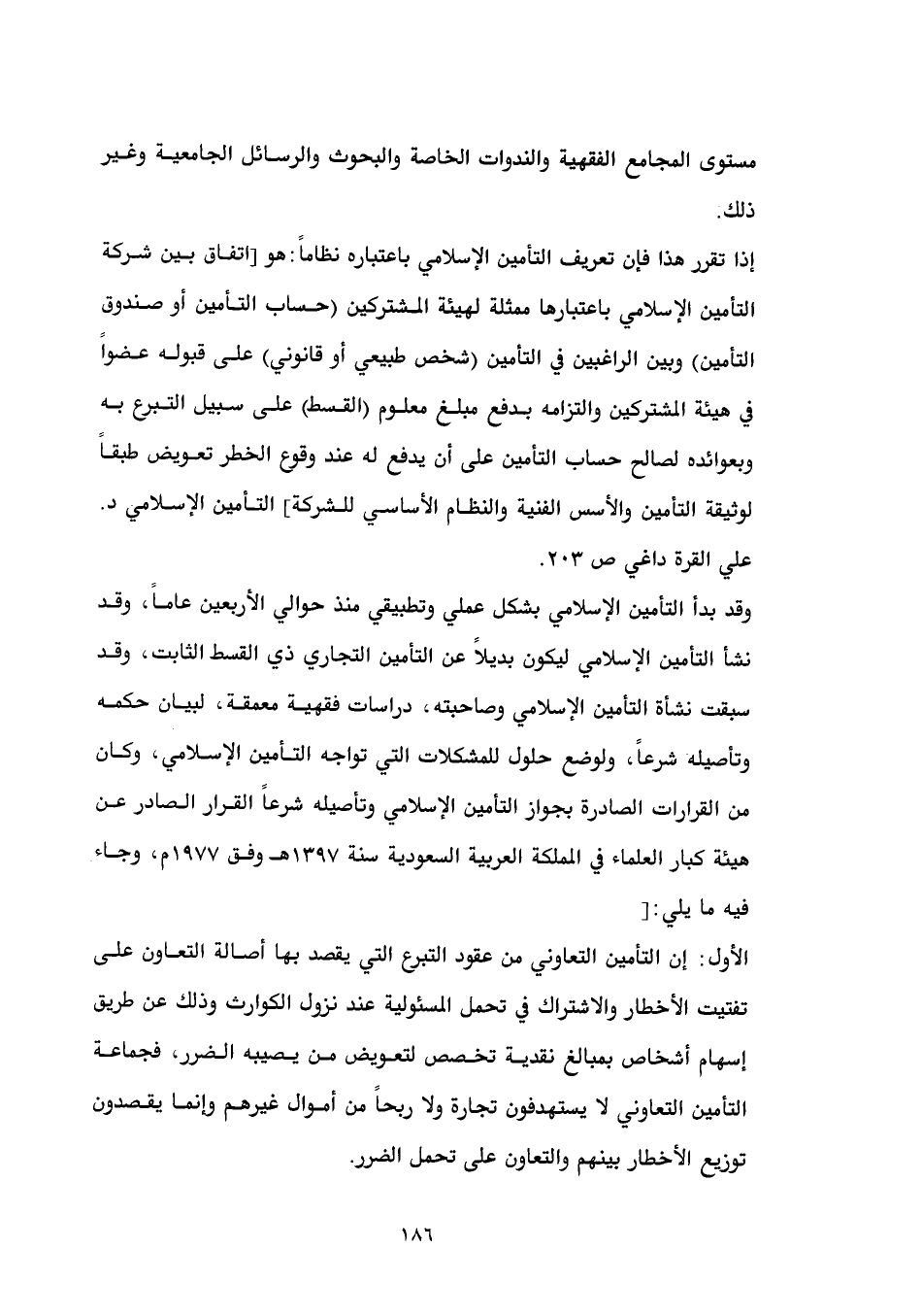 إذا تقرر هذا فإن تعريف التأمين الإسلامي باعتباره نظاماً: هو [اتفاق بين شركة التأمين الإسلامي باعتبارها ممثلة لهيئة المشتركين (حساب التأمين أو صندوق التأمين) وبين الراغبين في التأمين (شخص طبيعي أو قانوني) على قبوله عضواً في هيئة المشتركين والتزامه بدفع مبلغ معلوم (القسط) على سبيل التبرع به وبعوائده لصالح حساب التأمين على أن يدفع له عند وقوع الخطر تعويض طبقاً لوثيقة التأمين والأسس الفنية والنظام الأساسي للشركة] التأمين الإسلامي د. علي القرة داغي ص 203. وانظر أيضاً التأمين على حوادث السيارات د. حسين حامد حسان.