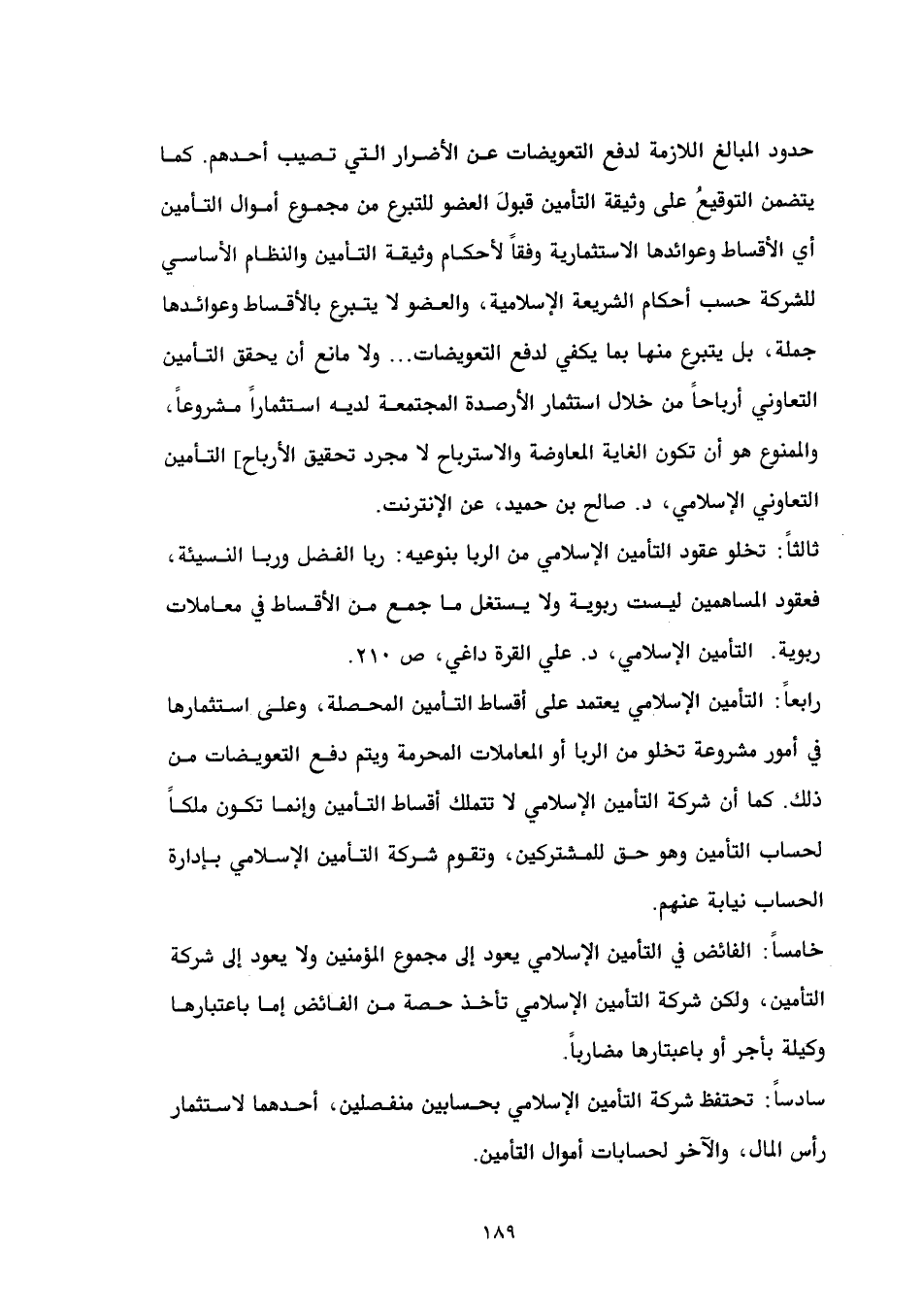 قبولَ العضو للتبرع من مجموع أموال التأمين أي الأقساط وعوائدها الاستثمارية وفقاً لأحكام وثيقة التأمين والنظام الأساسي للشركة حسب أحكام الشريعة الإسلامية، والعضو لا يتبرع بالأقساط وعوائدها جملة، بل يتبرع منها بما يكفي لدفع التعويضات ... ولا مانع أن يحقق التأمين التعاوني أرباحاً من خلال استثمار الأرصدة المجتمعة لديه استثماراً مشروعاً، والممنوع هو أن تكون الغاية المعاوضة والاسترباح لا مجرد تحقيق الأرباح] التأمين التعاوني الإسلامي د. صالح بن حميد عن الإنترنت.